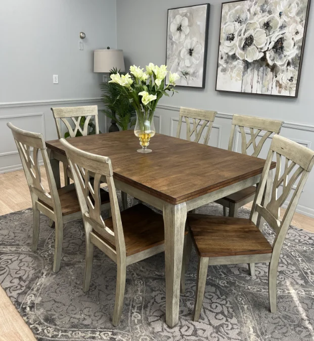 moreThis charming dining side chair brings a touch of rustic farmhouse charm to your dining space. Crafted from solid wood, it features a beautiful Light Grey finish with hints of Rustic Brown, creating a unique and inviting look.