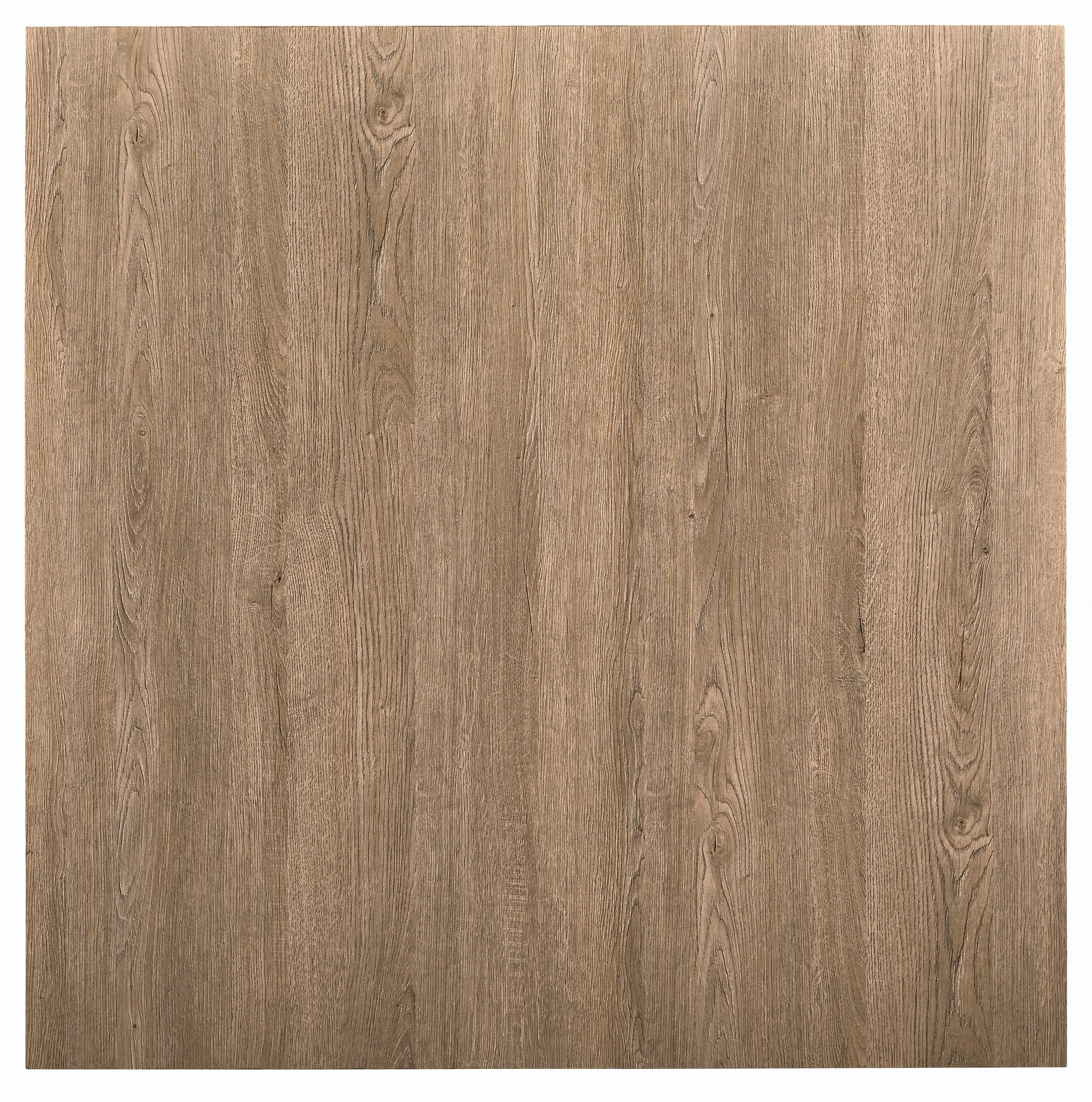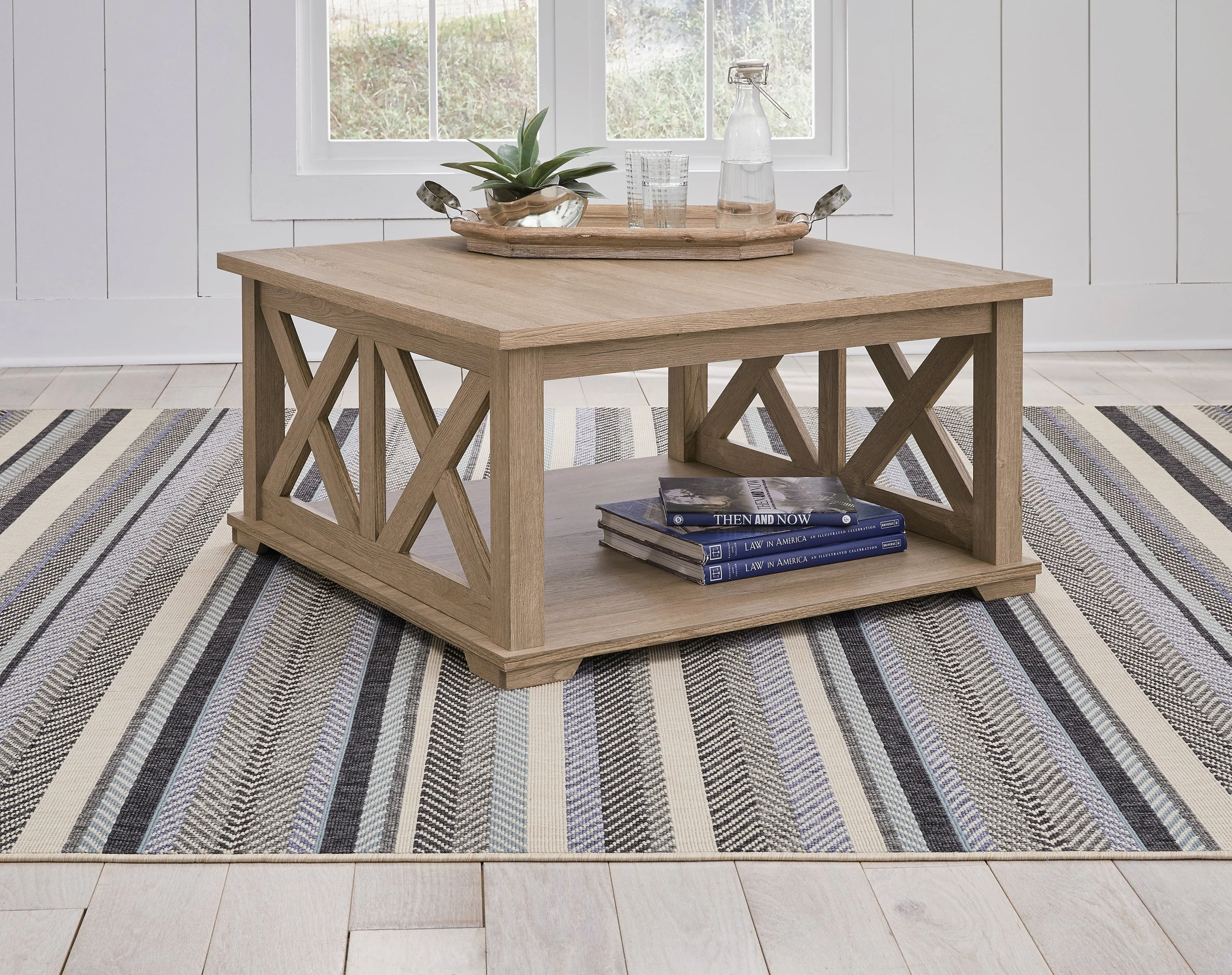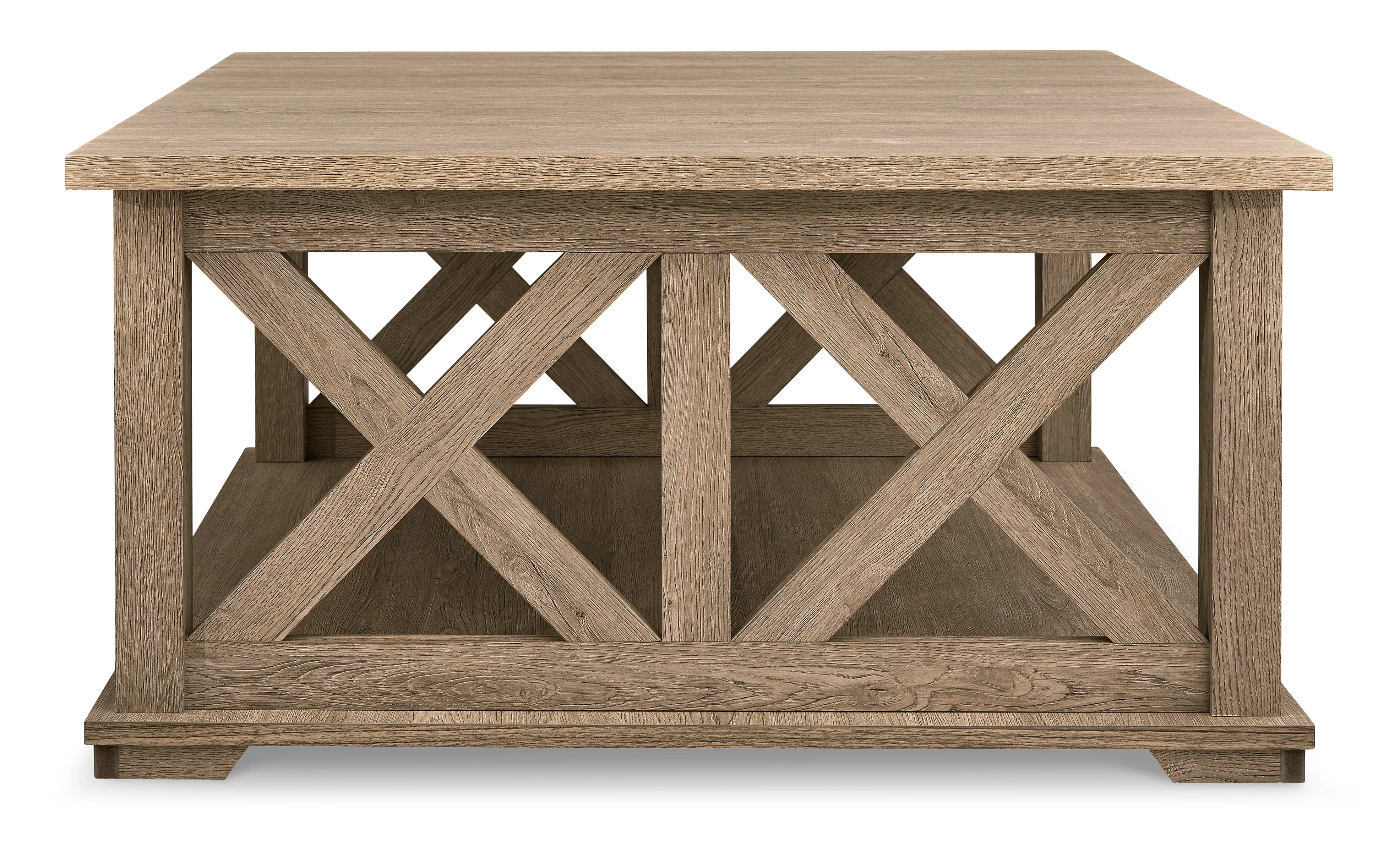 moreOpen the door to modern farmhouse style with this classic square coffee table that features a light natural oak wood grain pattern. The open crossbuck side panel detail and spacious lower shelf add even more rustic appeal.
