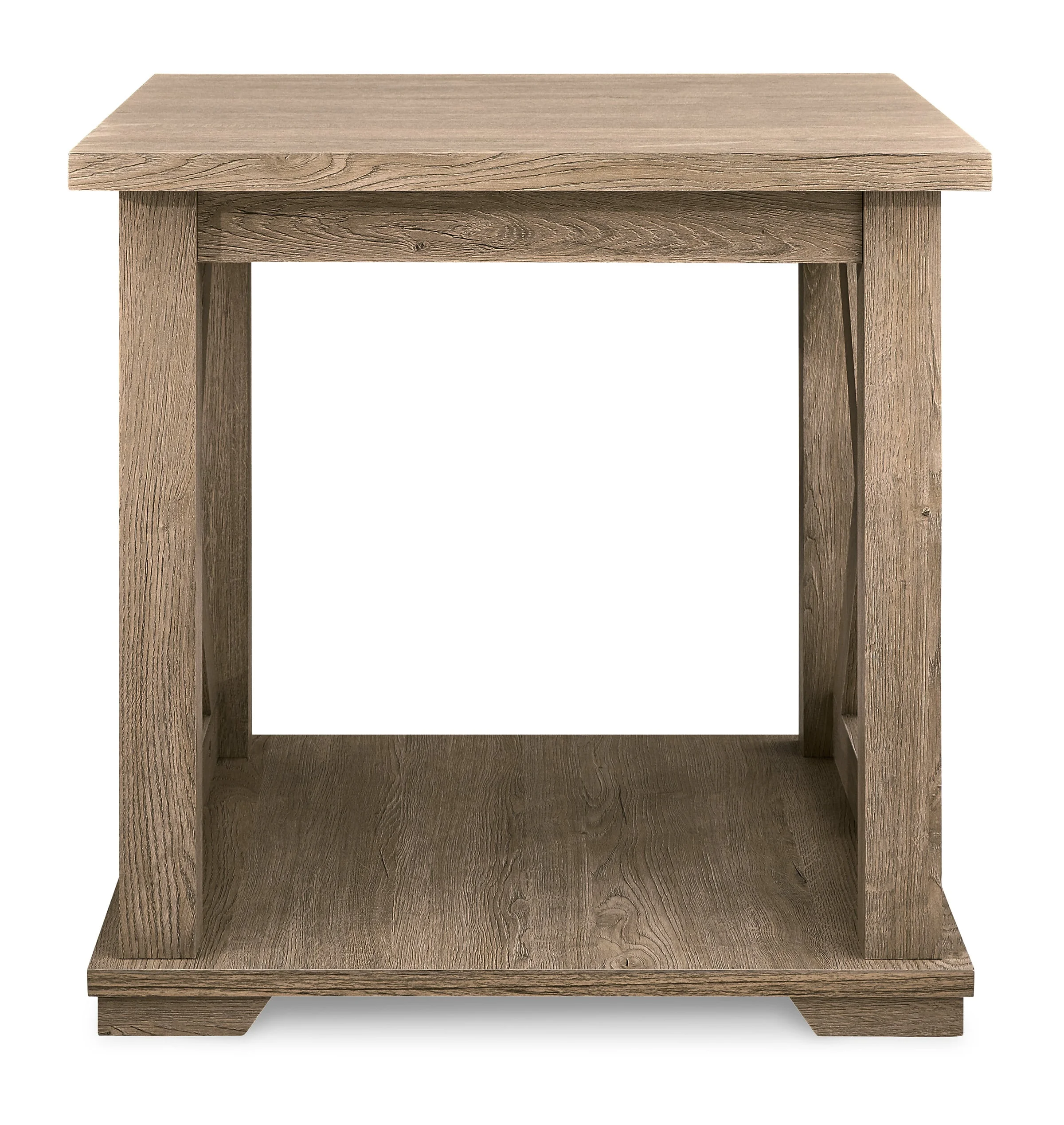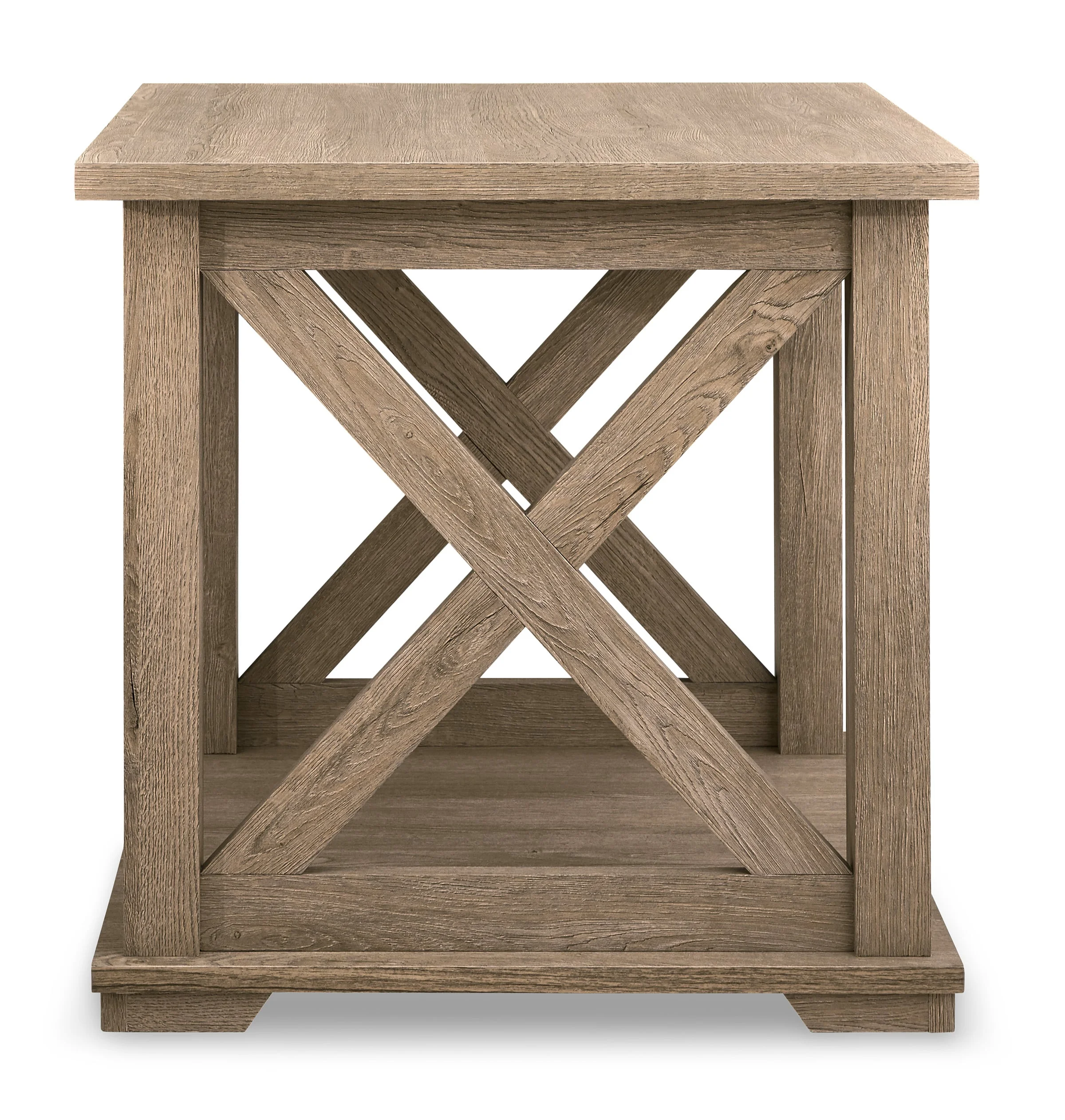 moreOpen the door to modern farmhouse style with this classic square end table that features a light natural oak wood grain pattern. The open crossbuck side panel detail and spacious lower shelf add even more rustic appeal.