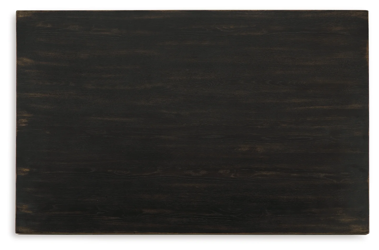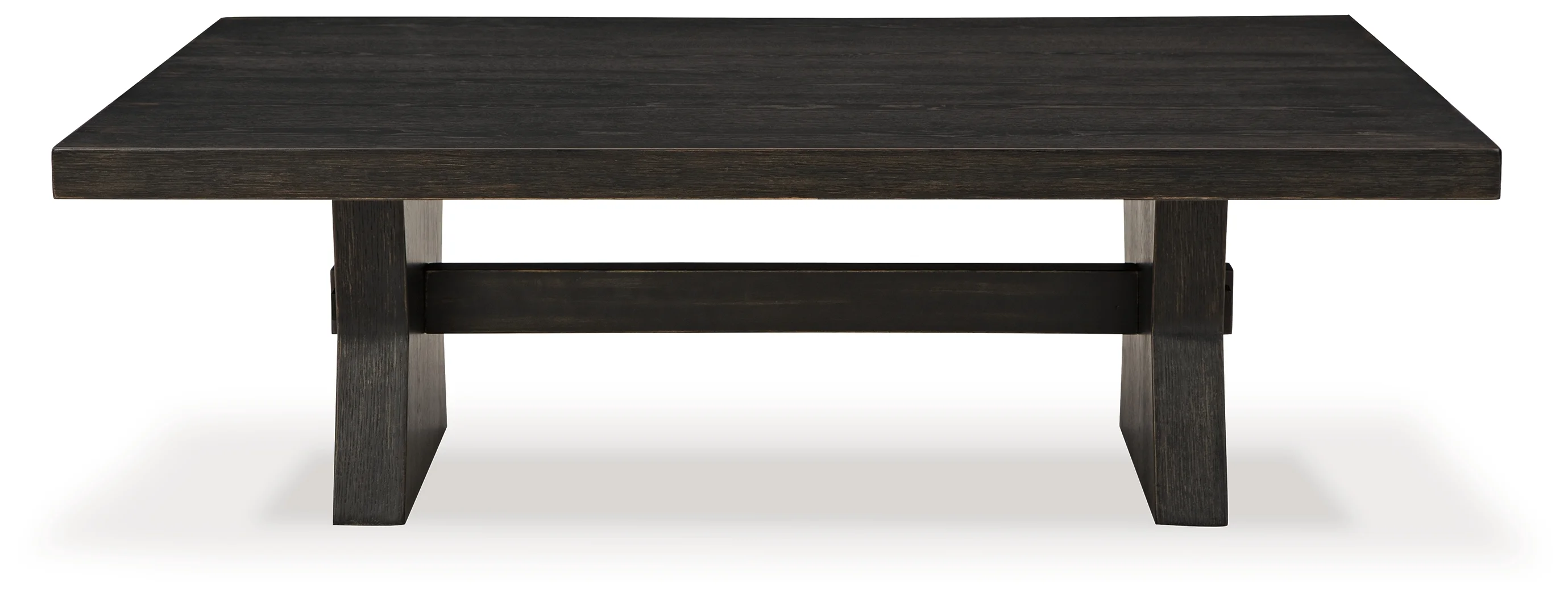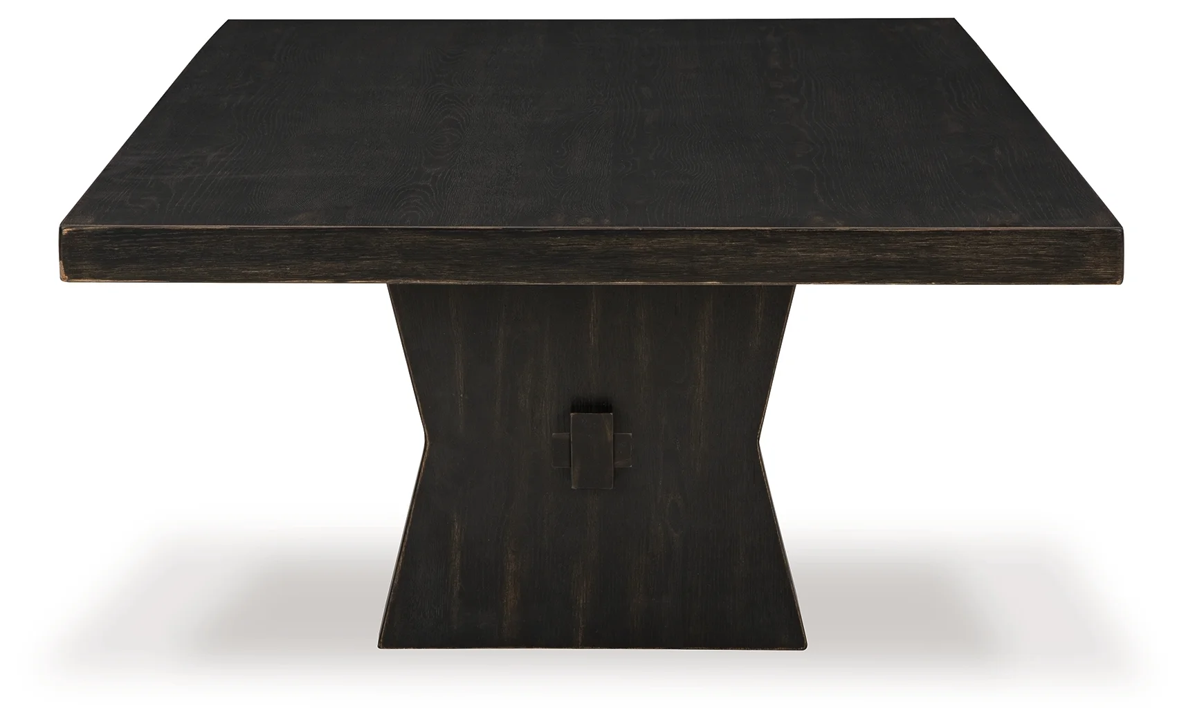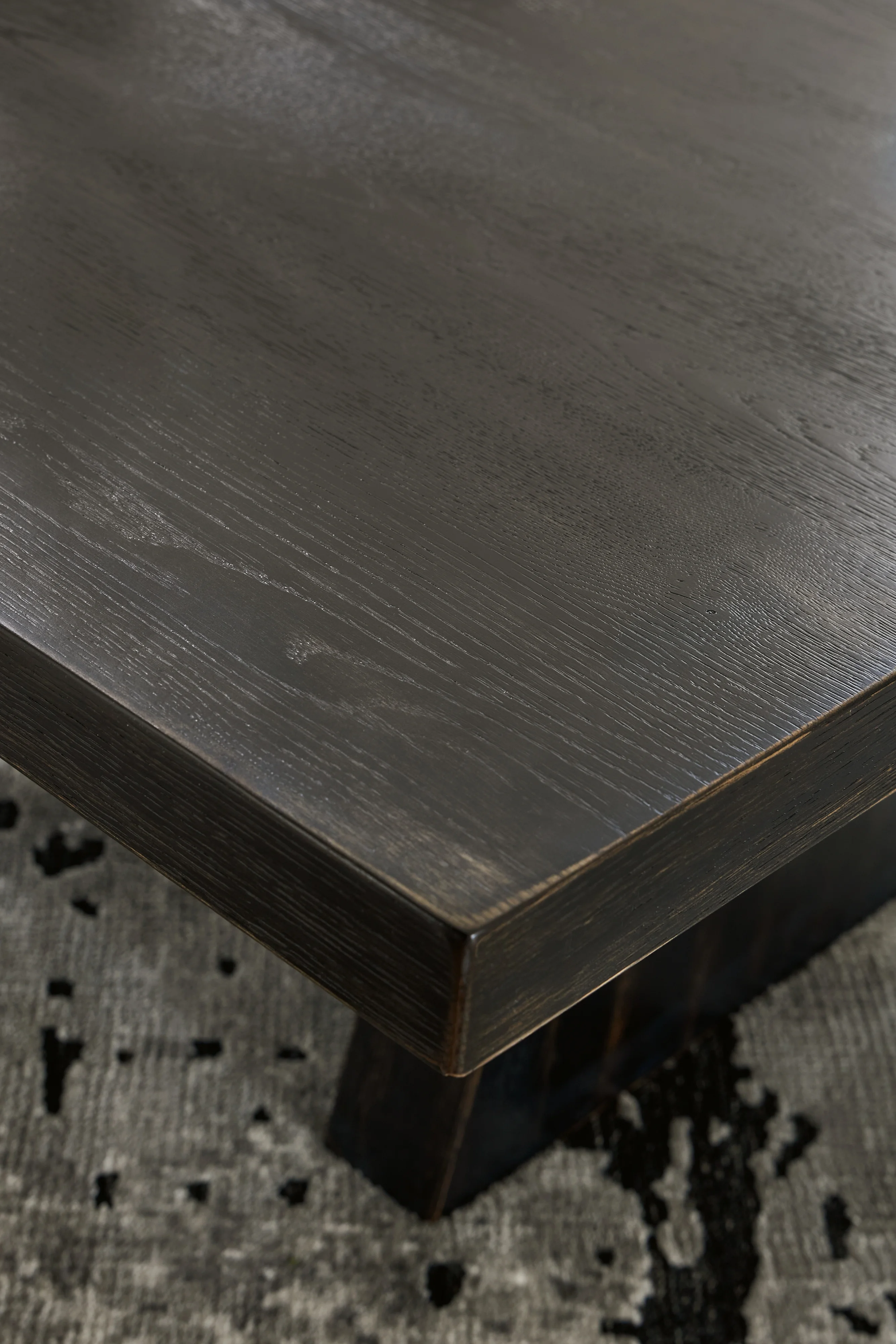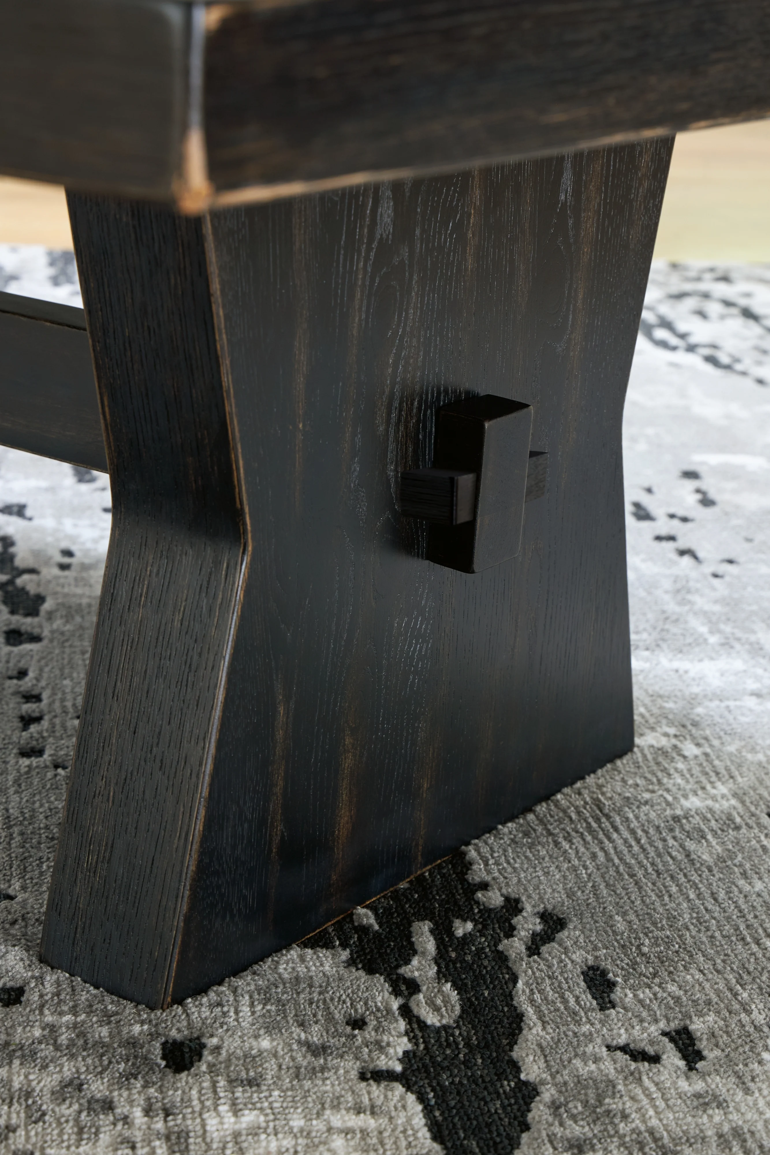 Bowtie-shaped base with through tenon look, Aged black finish with rubbed-through effects, Thick top, Made with hardwood solids, thick rustic oak veneer and MDF substrate