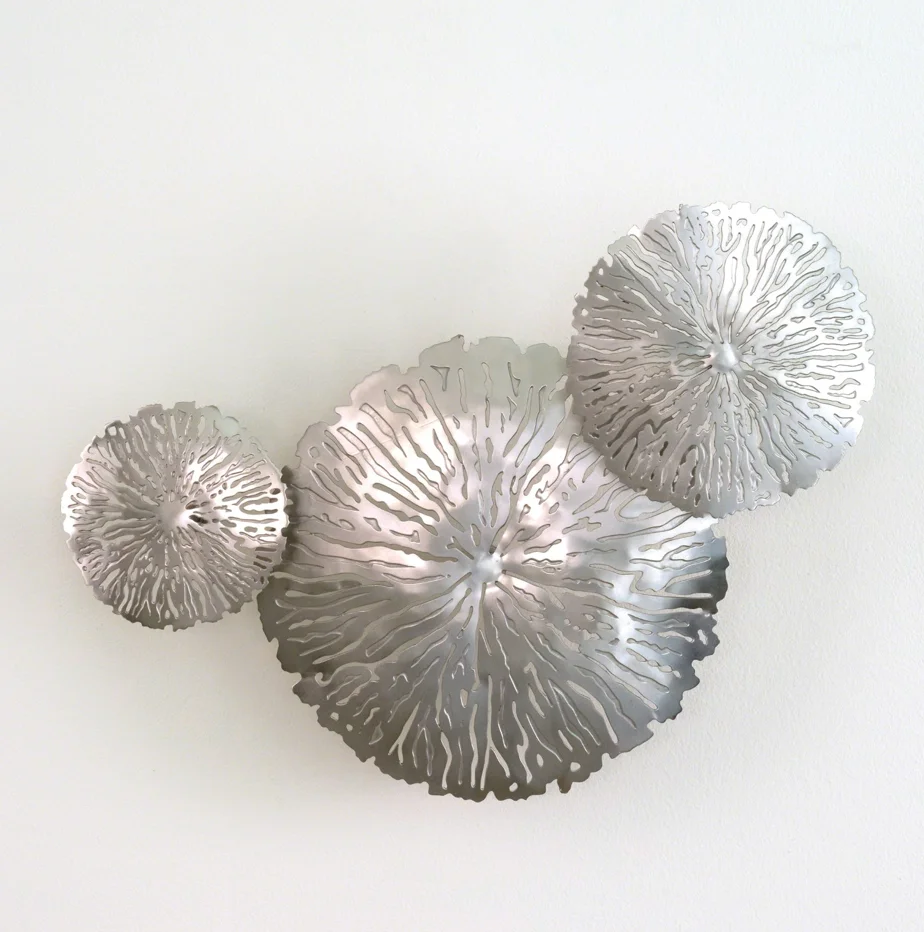 moreEach highly-detailed, antique nickel lily pad leaf is delicately perforated to allow only small amounts of light to pass through. A set of three includes one large, one medium and one small leaf complete with a mounting mechanism for each leaf. Use several clusters to create a multi-dimensional floral wall. Make Monet proud.