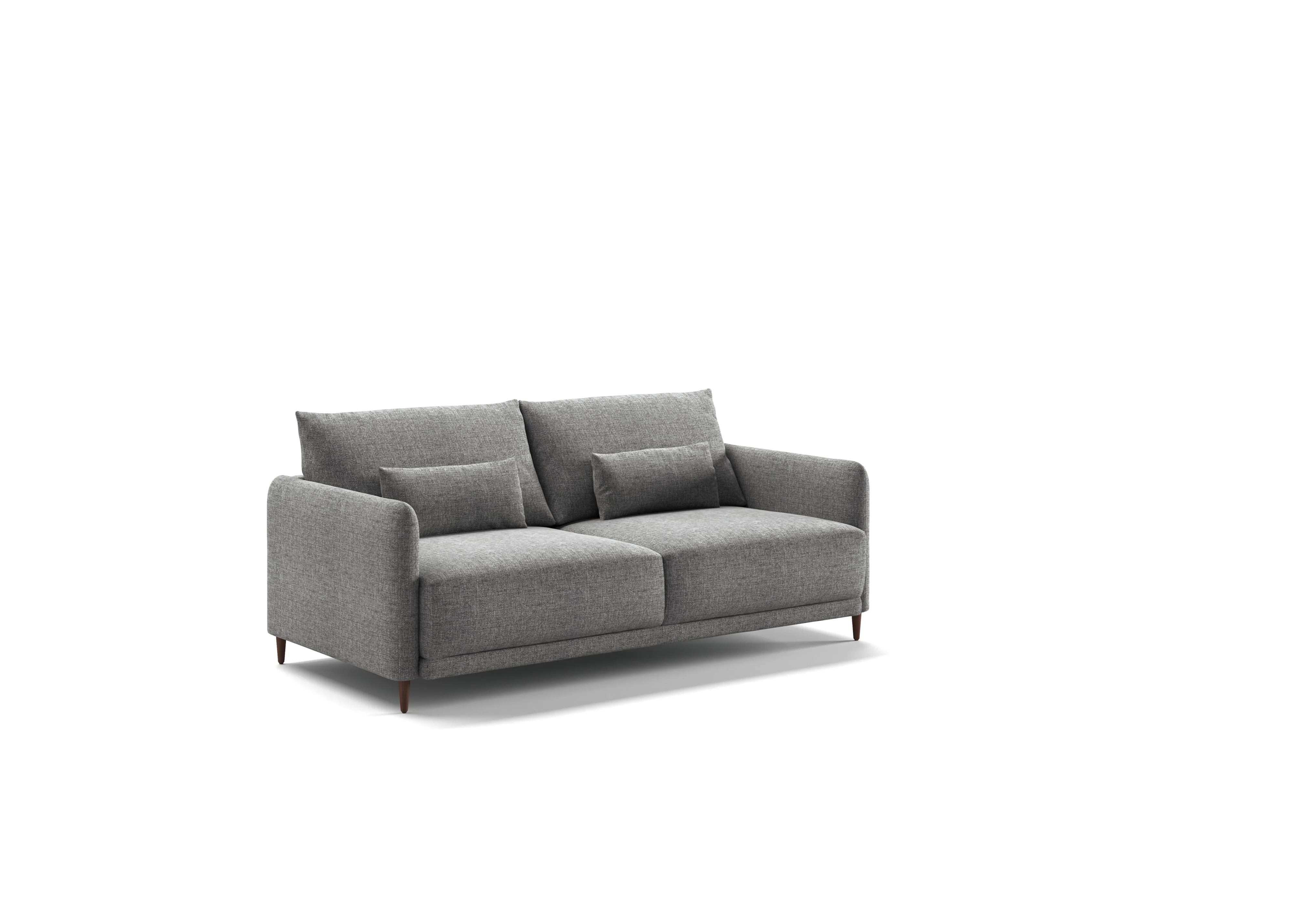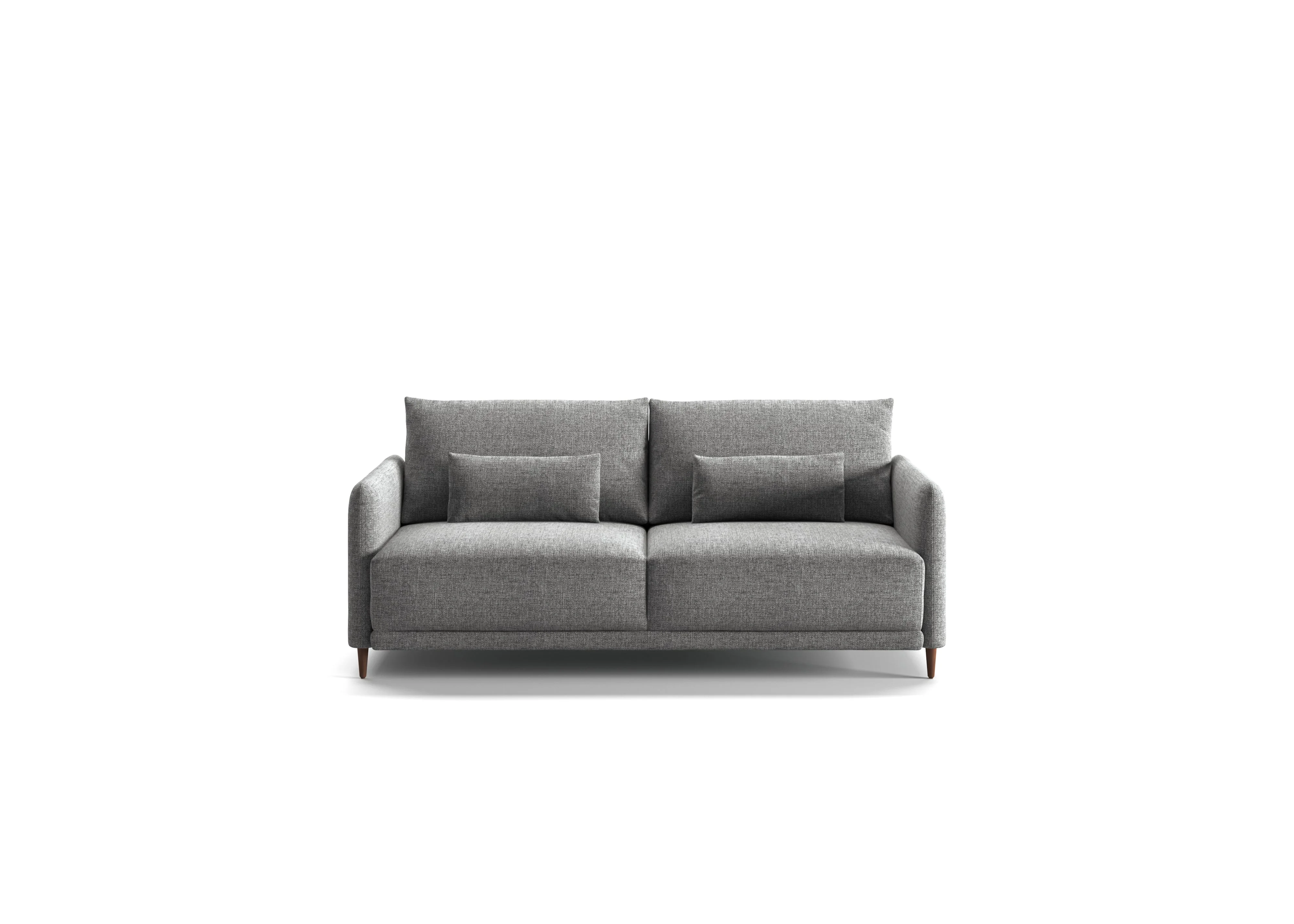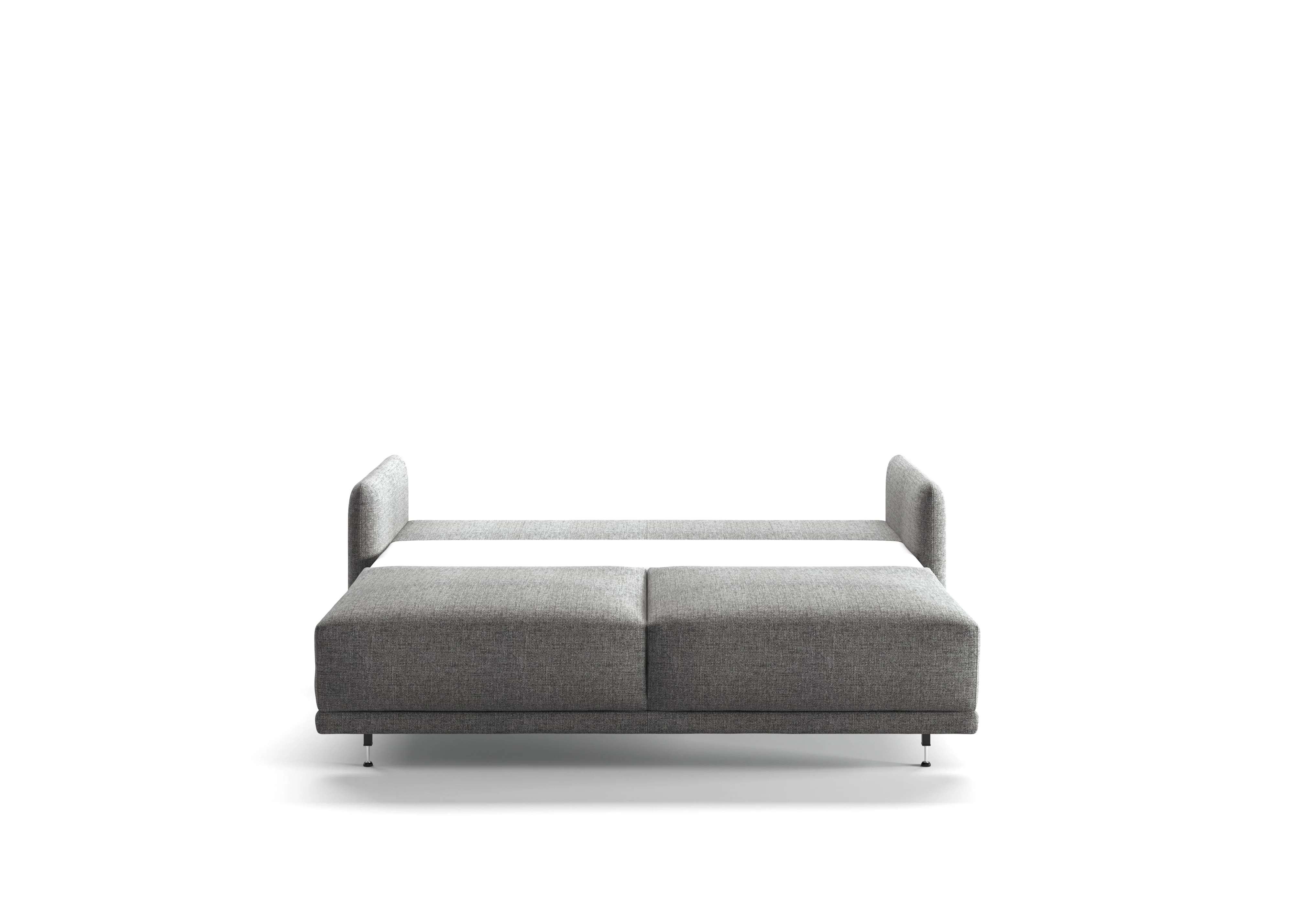 Hybrid Deluxe opens from the front of the frame, but this deluxe mechanism is a single motion. When lifting the seat up and out, the back rest automatically folds down to complete the bed. This function also has automatically stowing legs on high leg products to maintain the minimal look of only four legs on the floor when in sofa-mode.