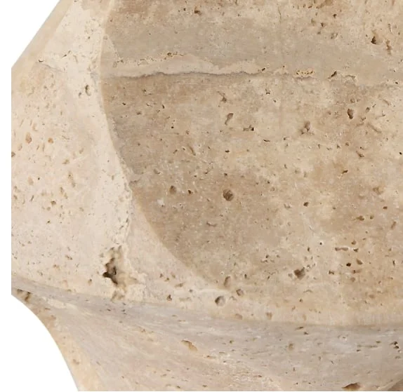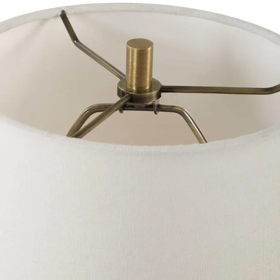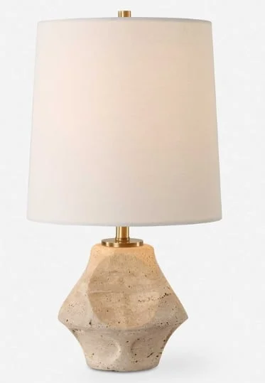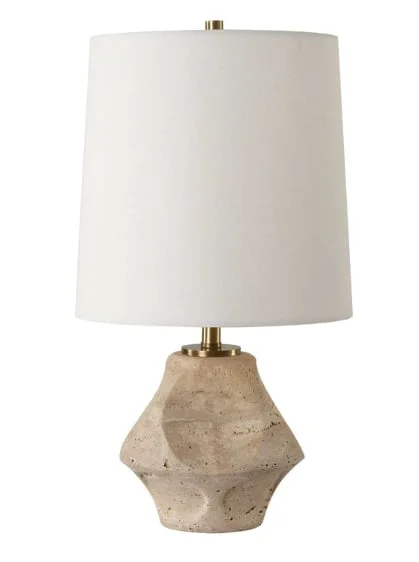 moreThis accent lamp features a scooped out travertine base paired with plated antique brass accents. The slightly tapered round hardback shade is covered in white linen fabric.