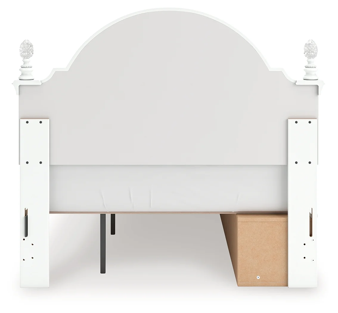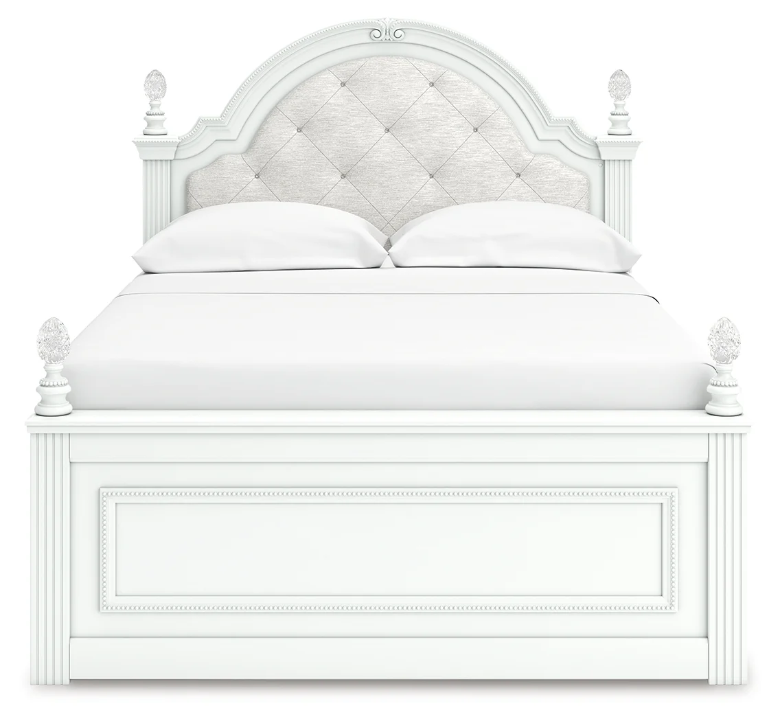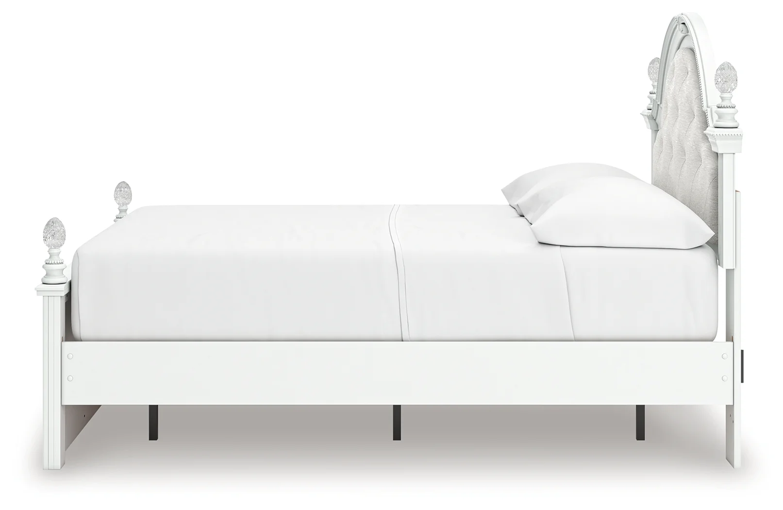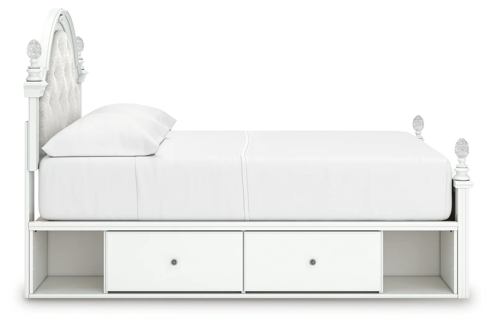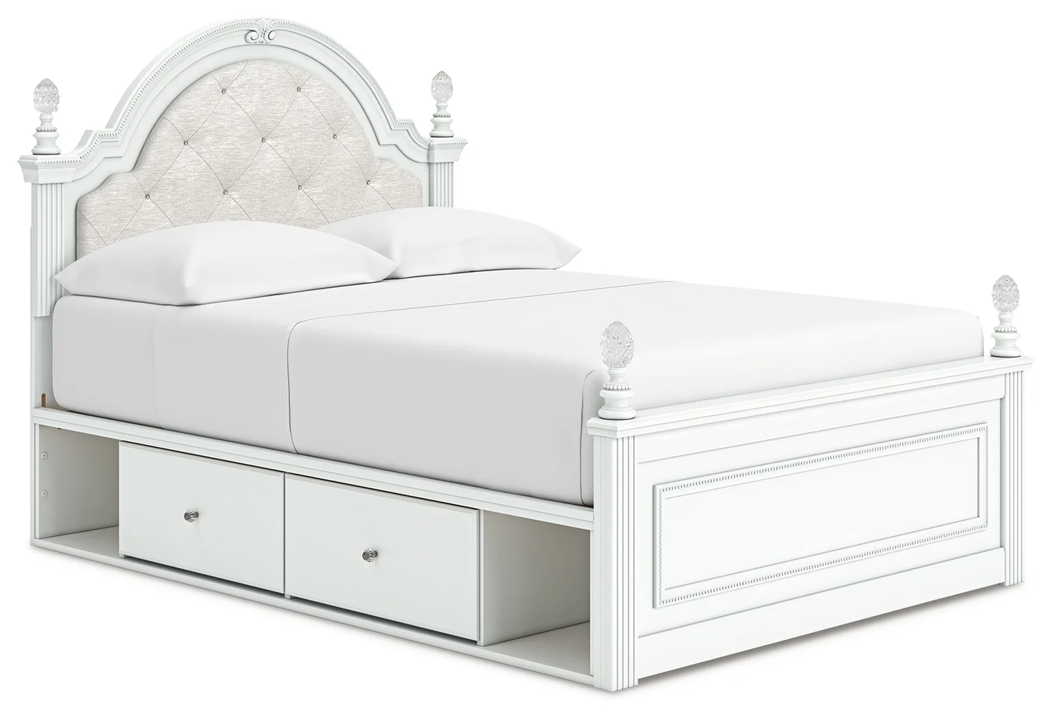 moreFit for a princess. This full upholstered panel storage bed’s crisp matte white finish pairs with charming ornate beading details and sumptuous button-tufted upholstery—perfect for your girly girl. Spacious storage drawers neatly tuck away bedroom essentials, while decorative ball tops and multicolored LED lighting in the headboard are the crowning touches to make your little one feel like royalty.