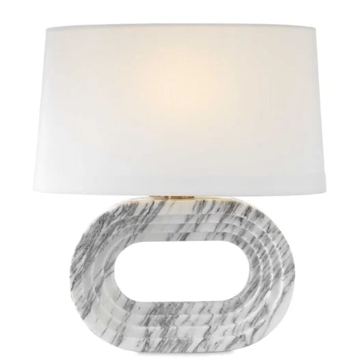 moreAn mini oval of Arabescato marble features concentric rings on front and back. Made from a single block of marble, it has an oval tapered hardback white faux silk shade, finished with 0.75" self trim. A braided taupe fabric cord drapes from the light socket and has an in-line dimmer.