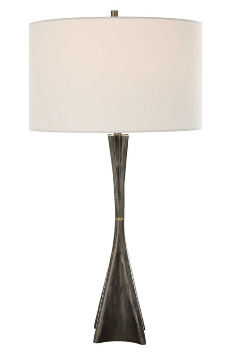 moreThis Cast Iron Lamp Embodies Both Masculine Industrial Style With A Subtle Pitted Texture Accented With Uneven Traces Of Brass Soldering That Enhance The Hand Crafted Construction, And A Feminine Quality With Bold Curves And Delicate Details. The Round Drum Shade Is Wrapped In A White Linen Fabric.