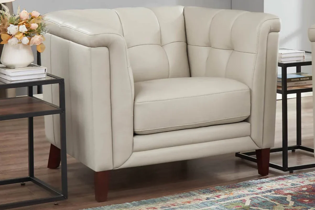 Premium Leather: Top-grain leather is upholstered on the seating areas and armrests. Split-grain leather is used on the sides and back.