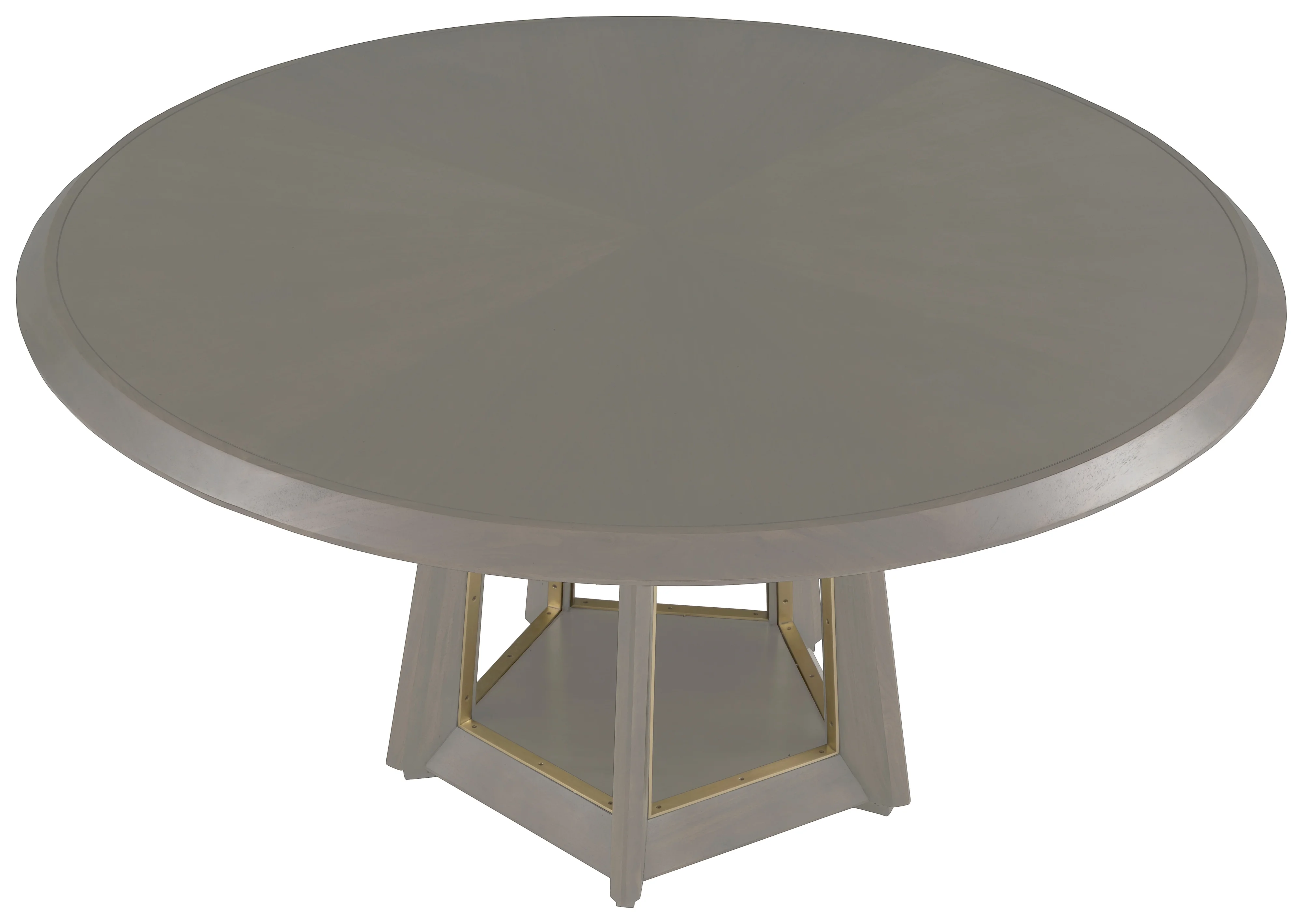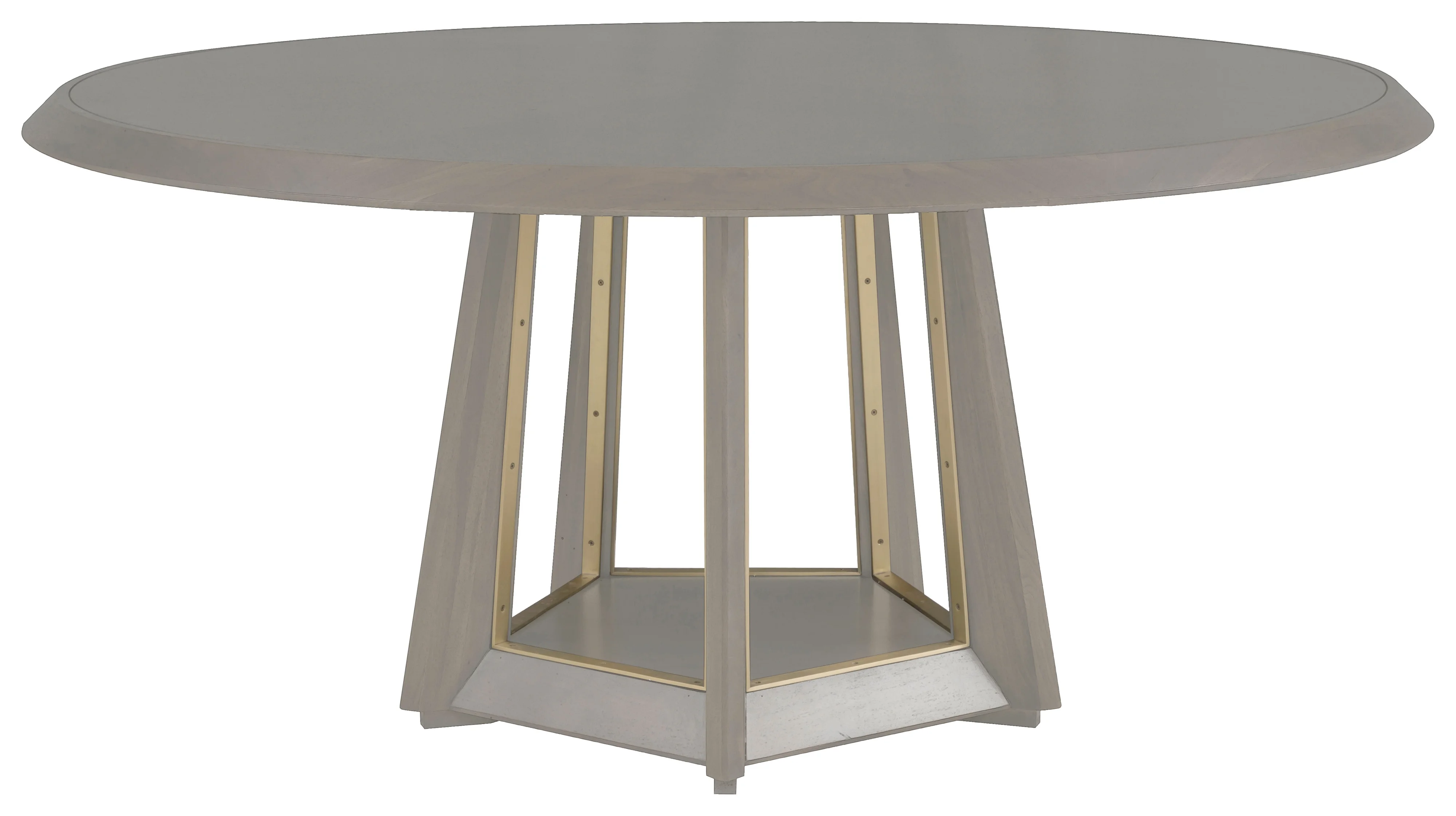 moreThe Benjamin Round Dining table features an intricate and architectural pedestal base. The base made up of a series of angled arches that have an inner metal detail that can come in polished nickel or brushed champagne brass, there are also decorative rivets that attach the metal trim to the legs. The wood species is ash, and the beautiful grain is featured in a series of triangular pie shaped pieces on the top, which is highlighted by the cerused espresso finish, leaving just enough white stain into the grain to form a star-like pattern in the center of the tabletop.