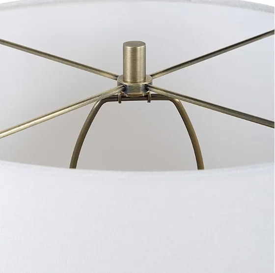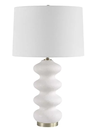 moreThis porcelain lamp exudes an elegant quality with its graceful flowing design and white tone-on-tone glaze. Its subtle texture adds depth and character, while brushed antique plated brass accents bring a touch of warmth and sophistication. Finished with a slightly tapered round hardback shade covered in a white linen fabric.