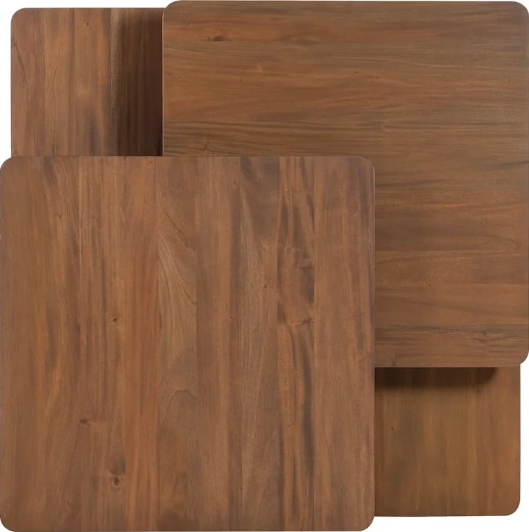 moreThe unexpected three-tier, offset design of the Burrow Tiered Coffee Table adds intrigue and interest to any living space. Crafted of Mahogany Solids, the square-shaped table is 40 x 40 and 16 inches high and offered in a warm Chestnut finish. One shelf.