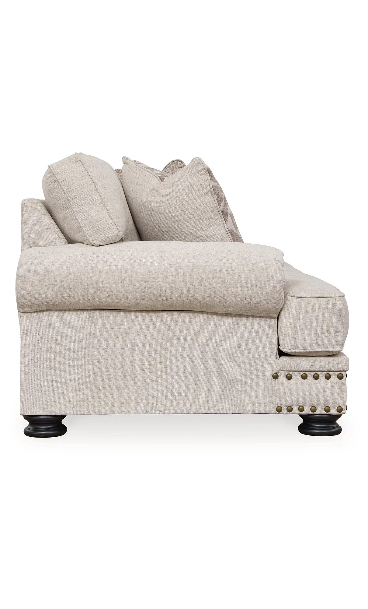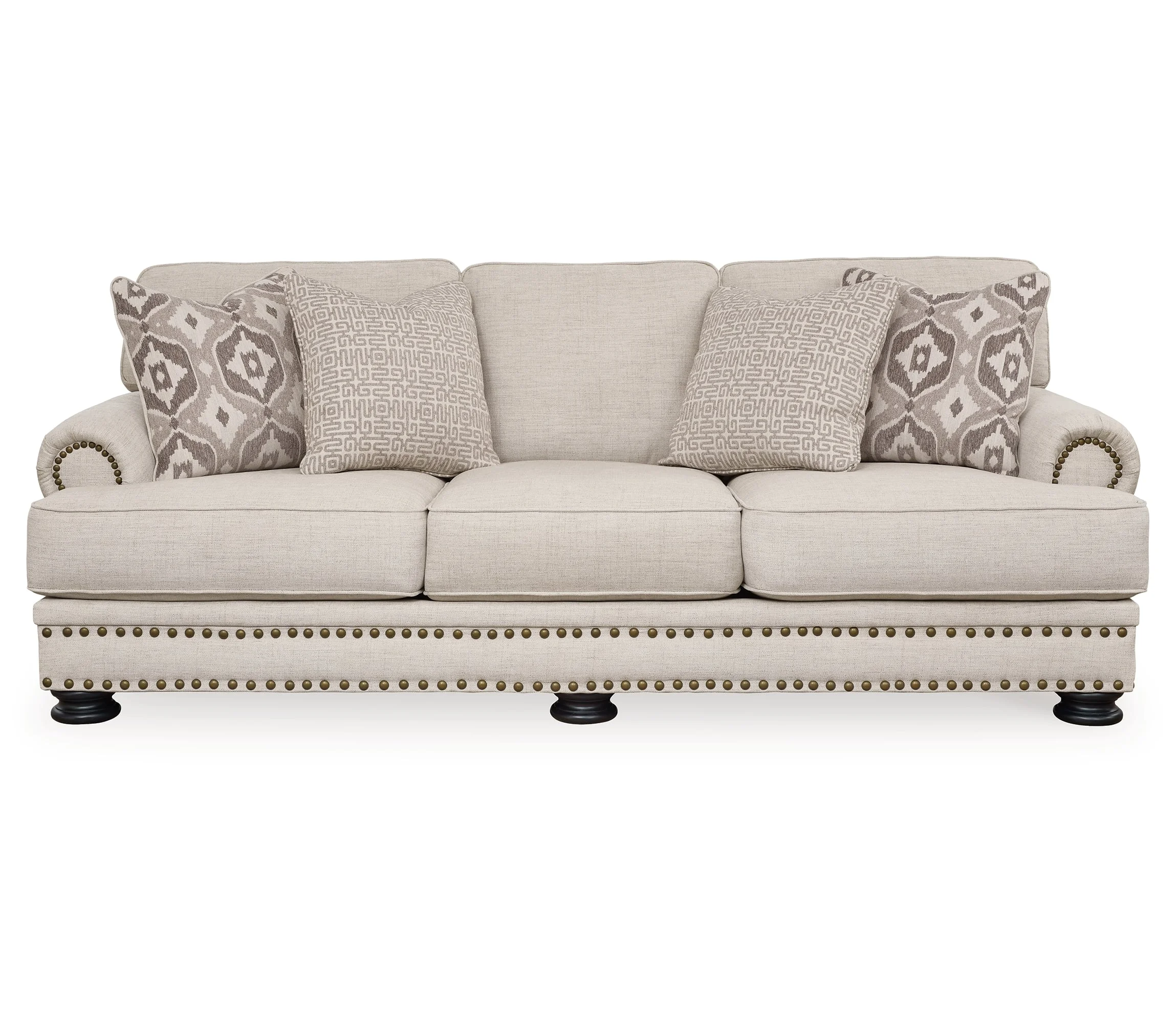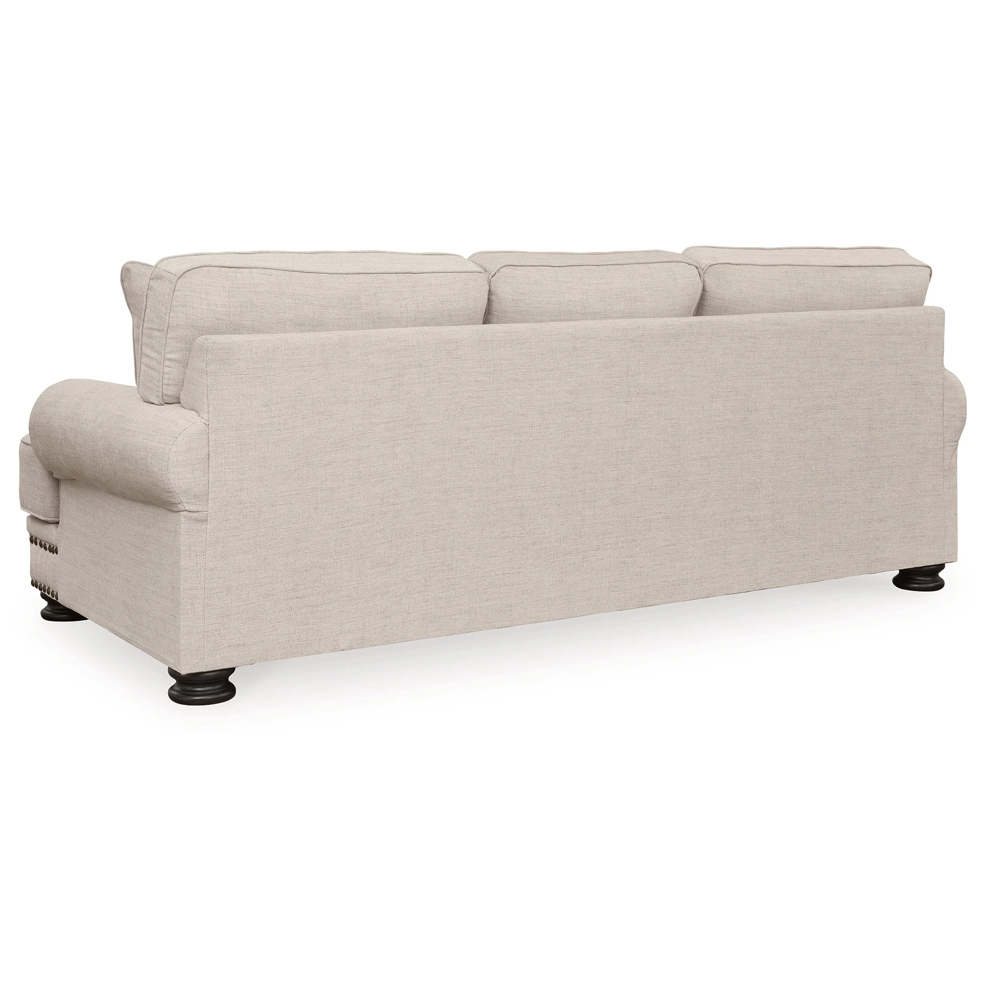 Talk about a looker. This sofa has folks head over heels in love. More than easy on the eyes—with its nailhead trim accents, linen-look upholstery and newfangled decorative turned legs—it’s also got quality and substance. There's room enough for cuddling up with someone special or sprawling out solo.