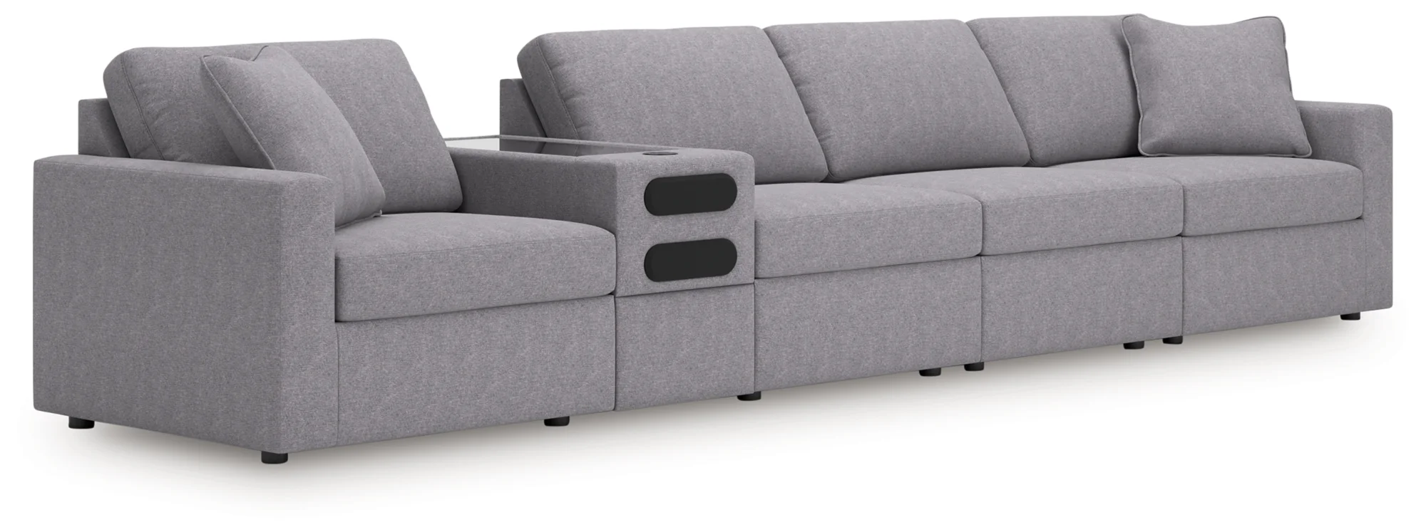 • Includes 5 modular pieces: left-arm facing corner chair, audio console with storage, 2 armless chairs and right-arm facing corner chair