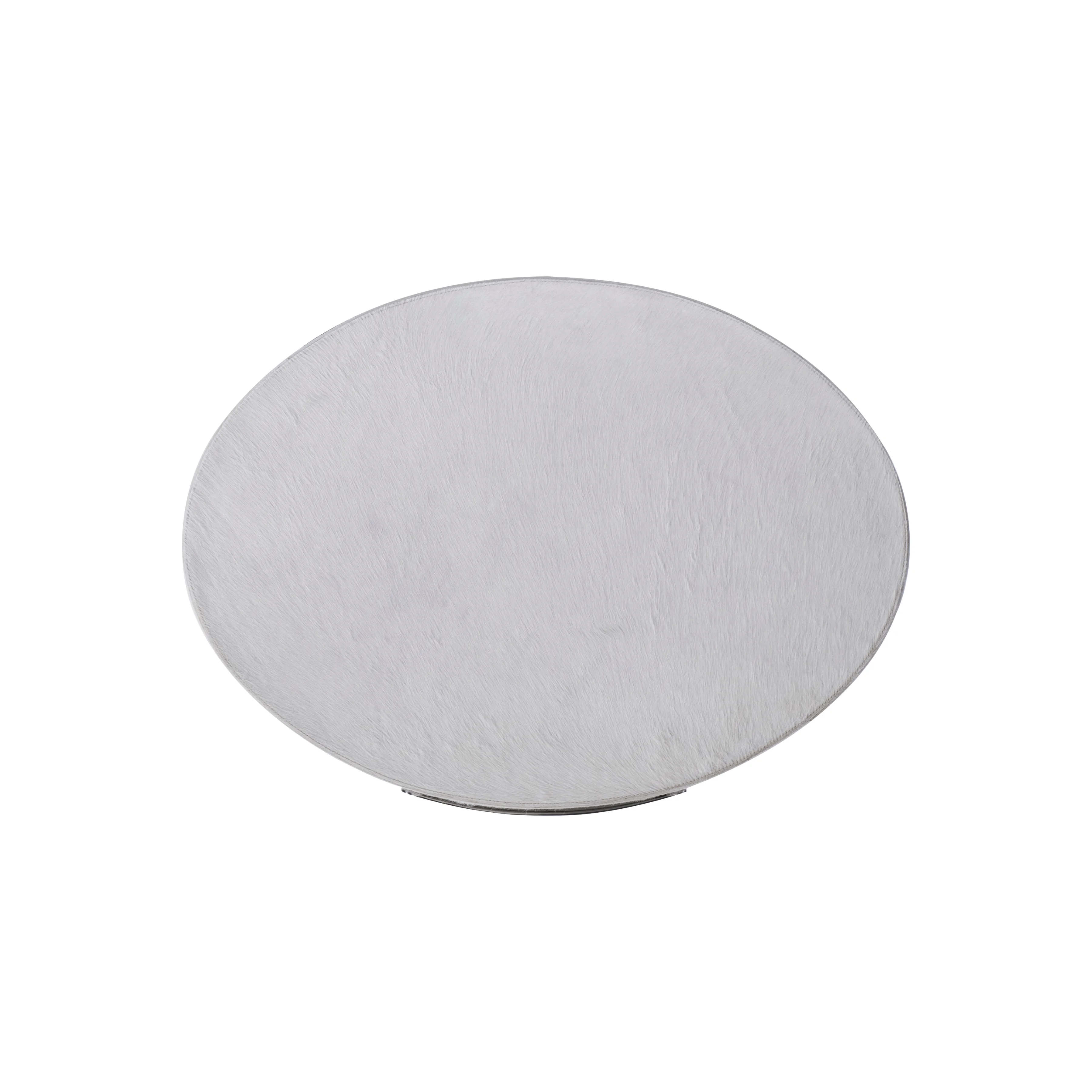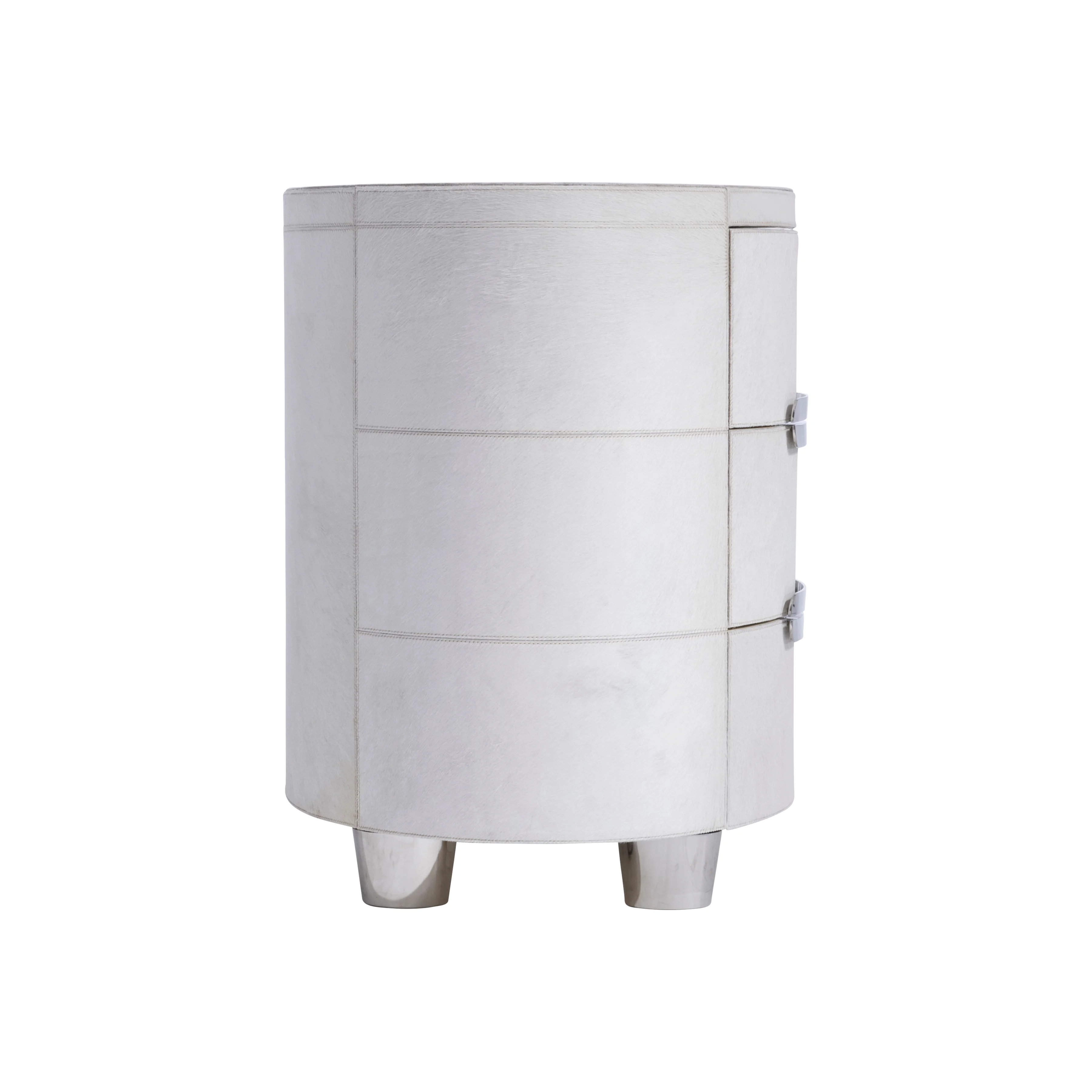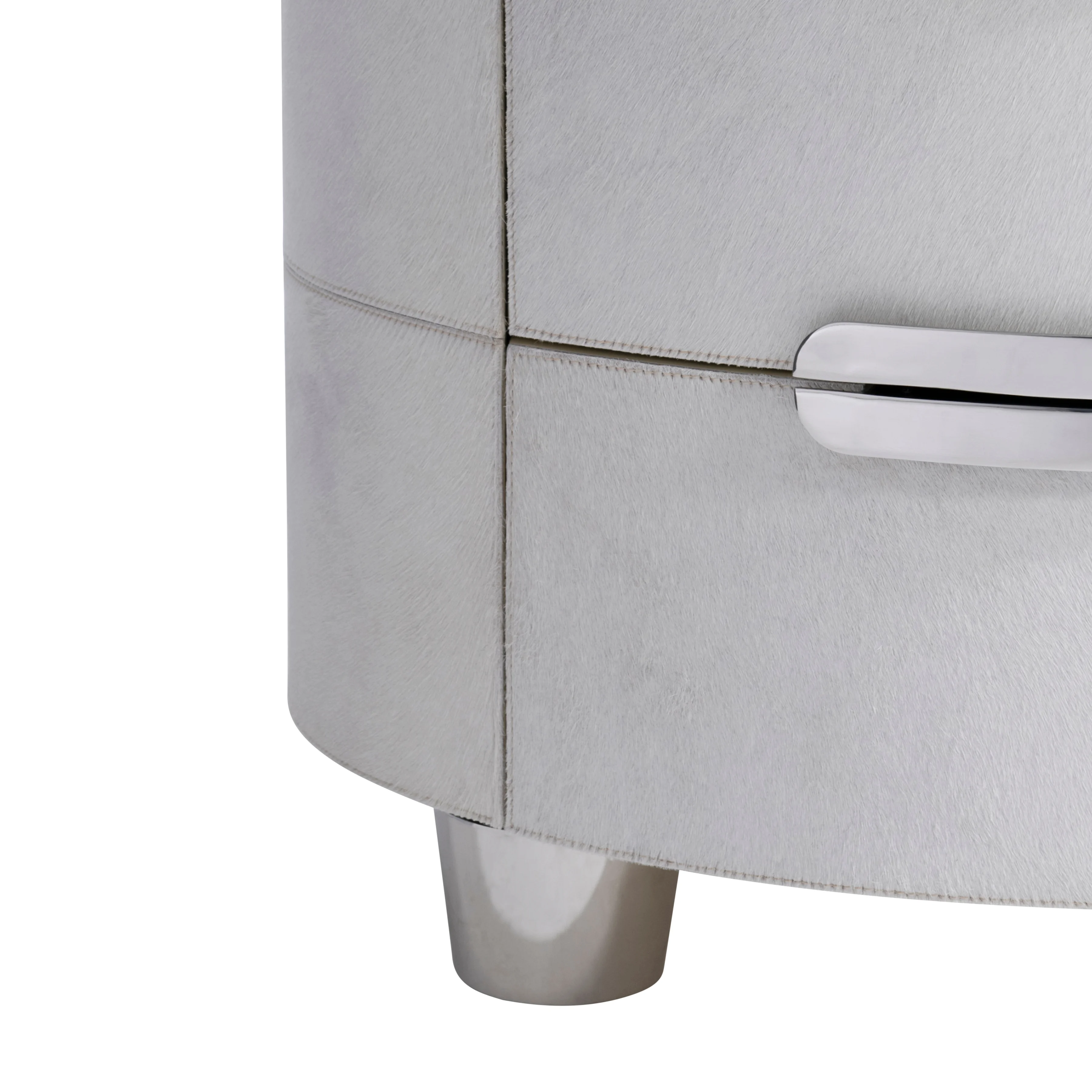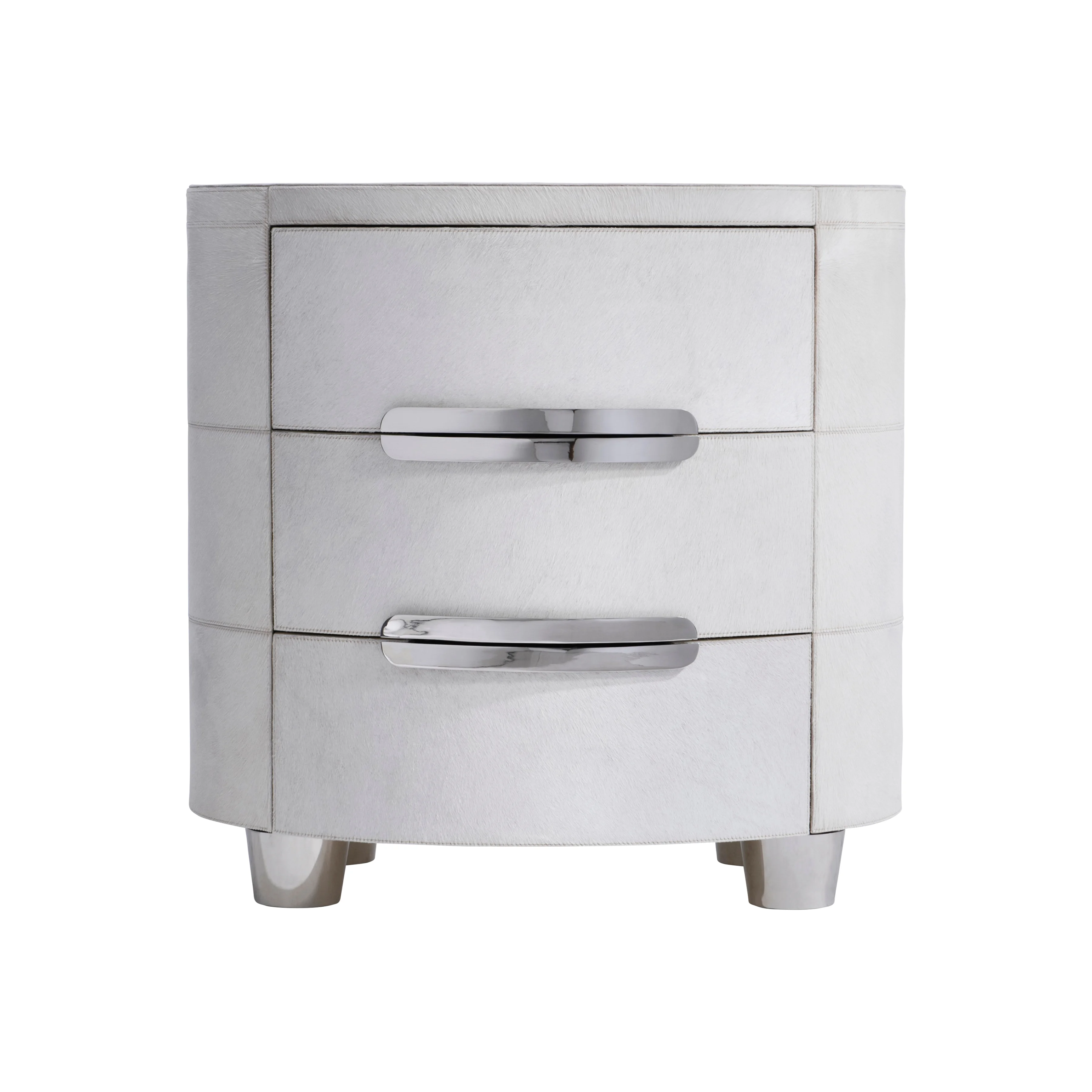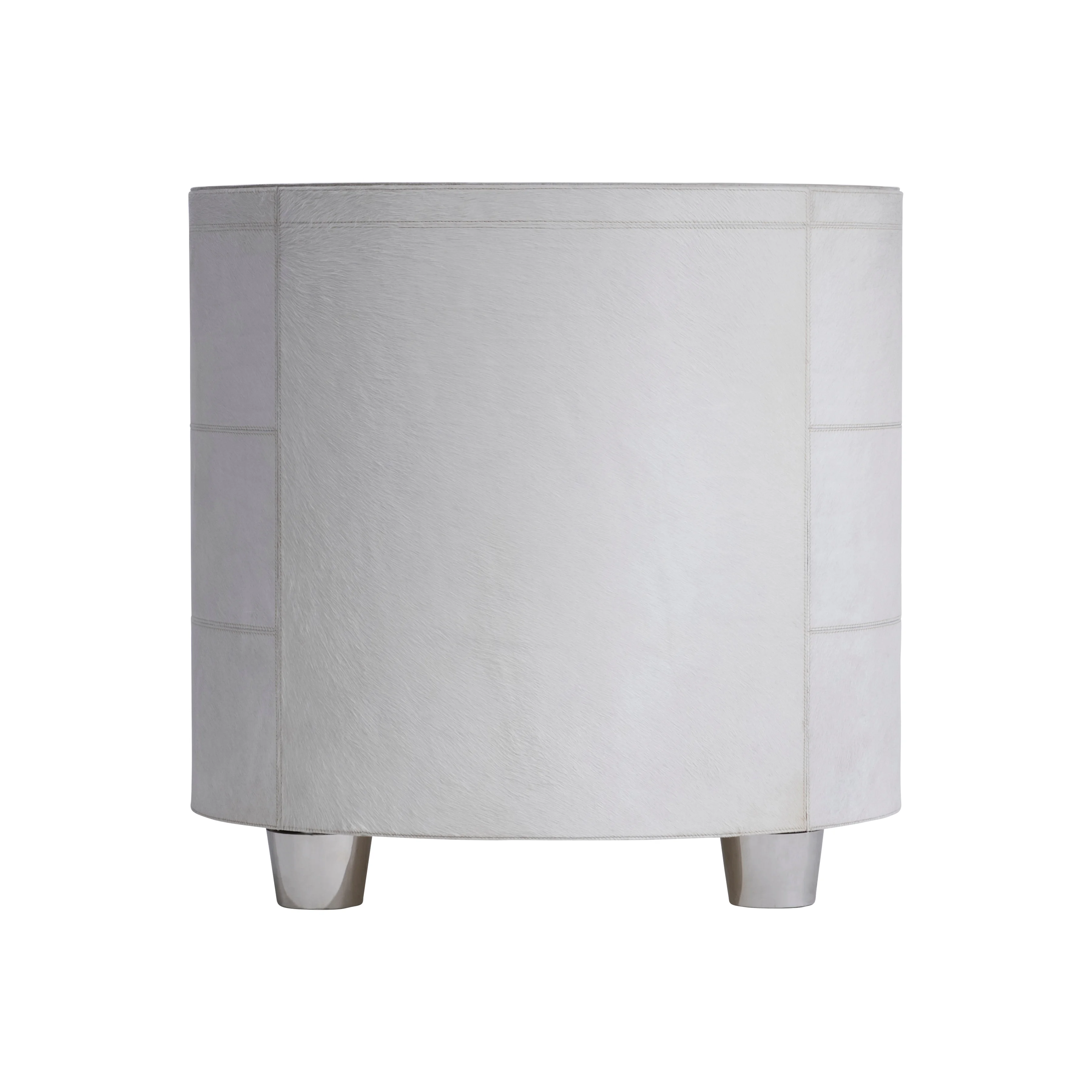 Oval shape, fully wrapped in white hair on hide with saddle stitching, Three soft-close drawers, Metal hardware and four tapered round feet in Polished Stainless Steel finish, Glass top included, Adjustable glides, Specifications subject to change without notice