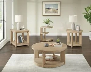moreBring the outside in with the light and airy, casual style of the Pacific Grove collection. You’ll find a perfect blend of modern, rustic, and coastal design aesthetics with rounded shapes and neutral tones. Solid hardwood construction ensures longevity to the large cocktail table on casters and three different end tables. The multi-step warm sandy finish, featuring rasping and sand-through techniques, is complemented by light wire-brushing and white glazing to enhance the natural grain of oak veneers and highlight the beautiful quarter-turned pattern. The Pacific Grove’s casual, yet sophisticated look will bring out the best in your space.
