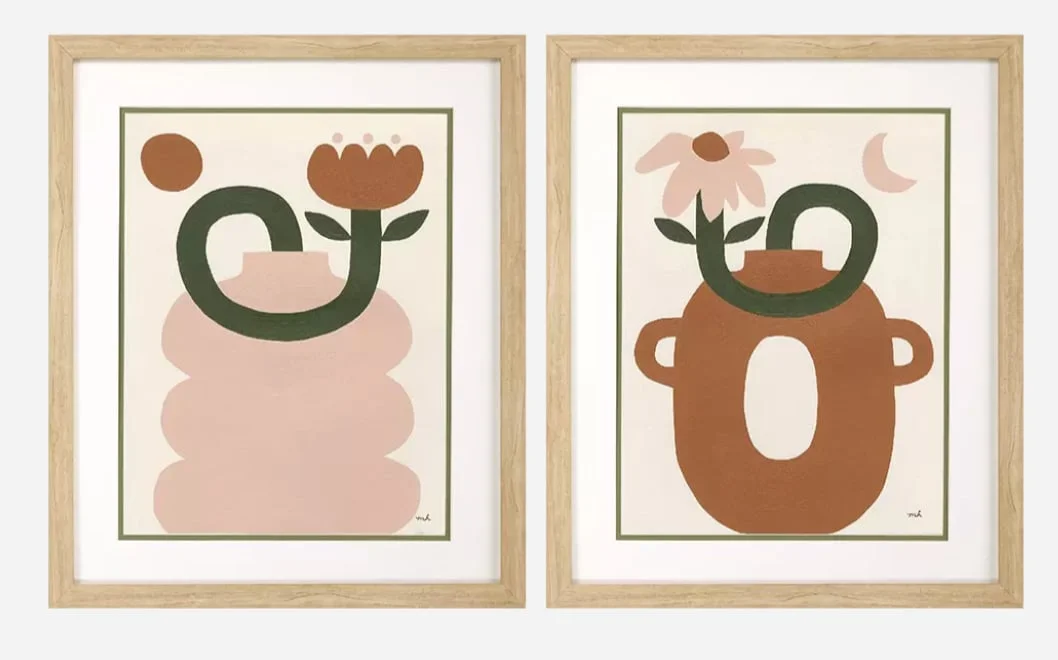 moreGraphic floral blossoms are paired with modern vases for a contemporary still life. Matted in white and framed in a natural wood finish moulding.