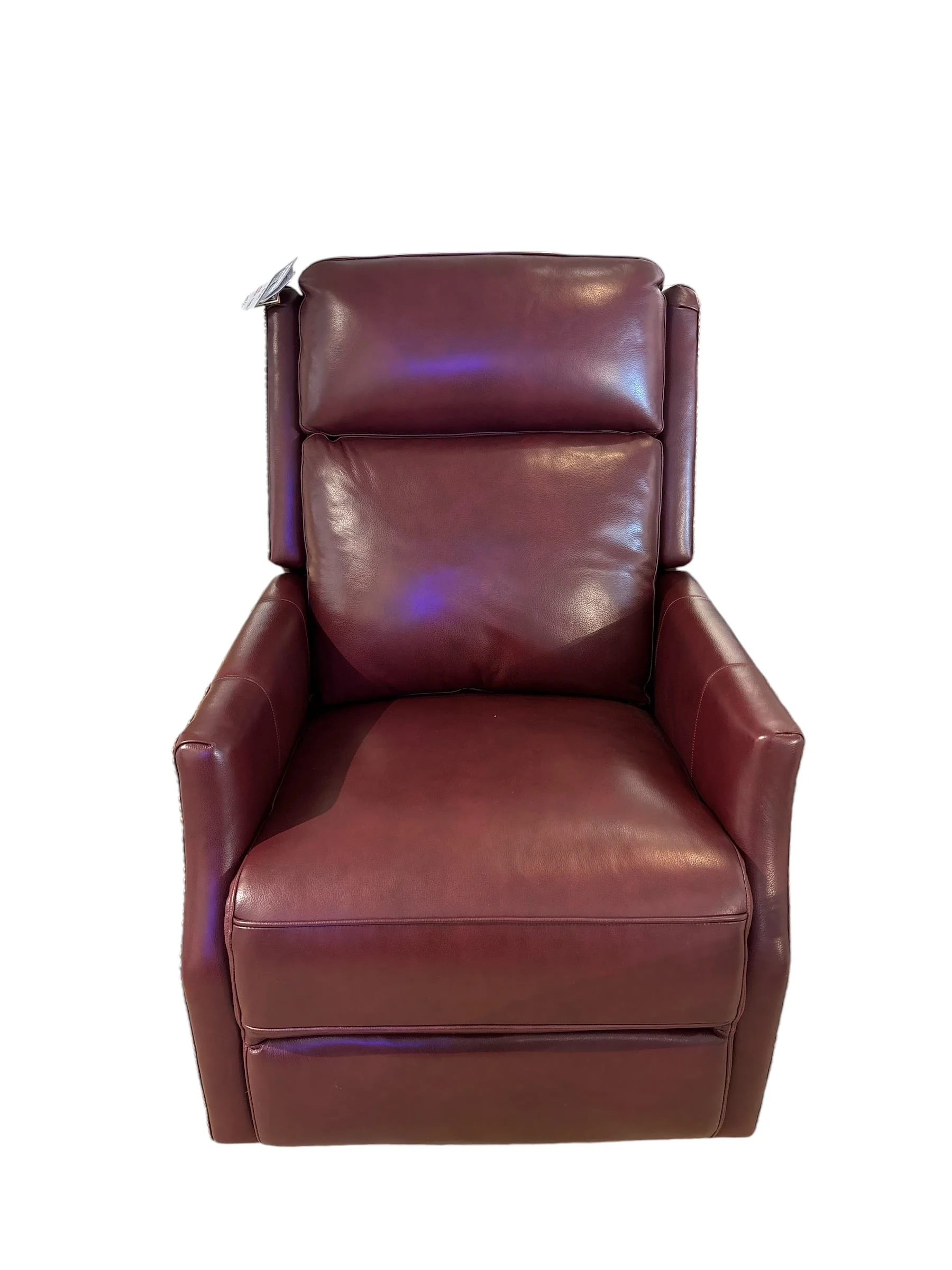 moreSmaller scale slim line shaped arm swivel glider with power recline and power headrest. Winged pub back design with box seat styled pad over chaise seating with pocketed coil springs encased in foam, wrapped in Dacron with a feather down blend topper. Nail head trim accents on outside arms and wings. USB port.