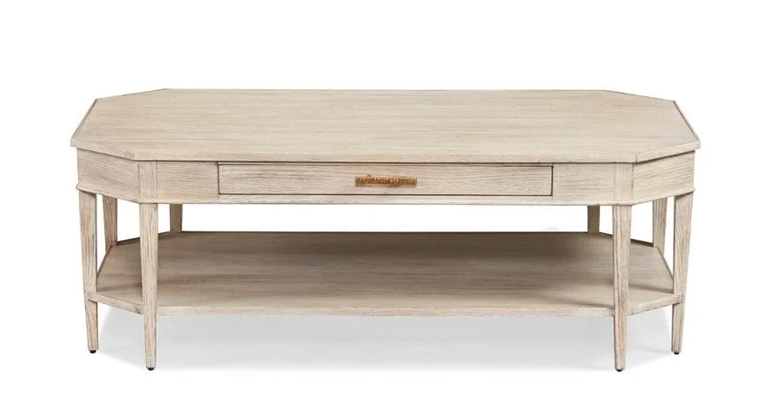 Rectangular cocktail table with clipped corner top and a lower shelf constructed of quarter-sawn oak veneers and housing a single drawer in the center apron. The finish is a very labor intensive earth grey contrasted with the champagne textured hardware.