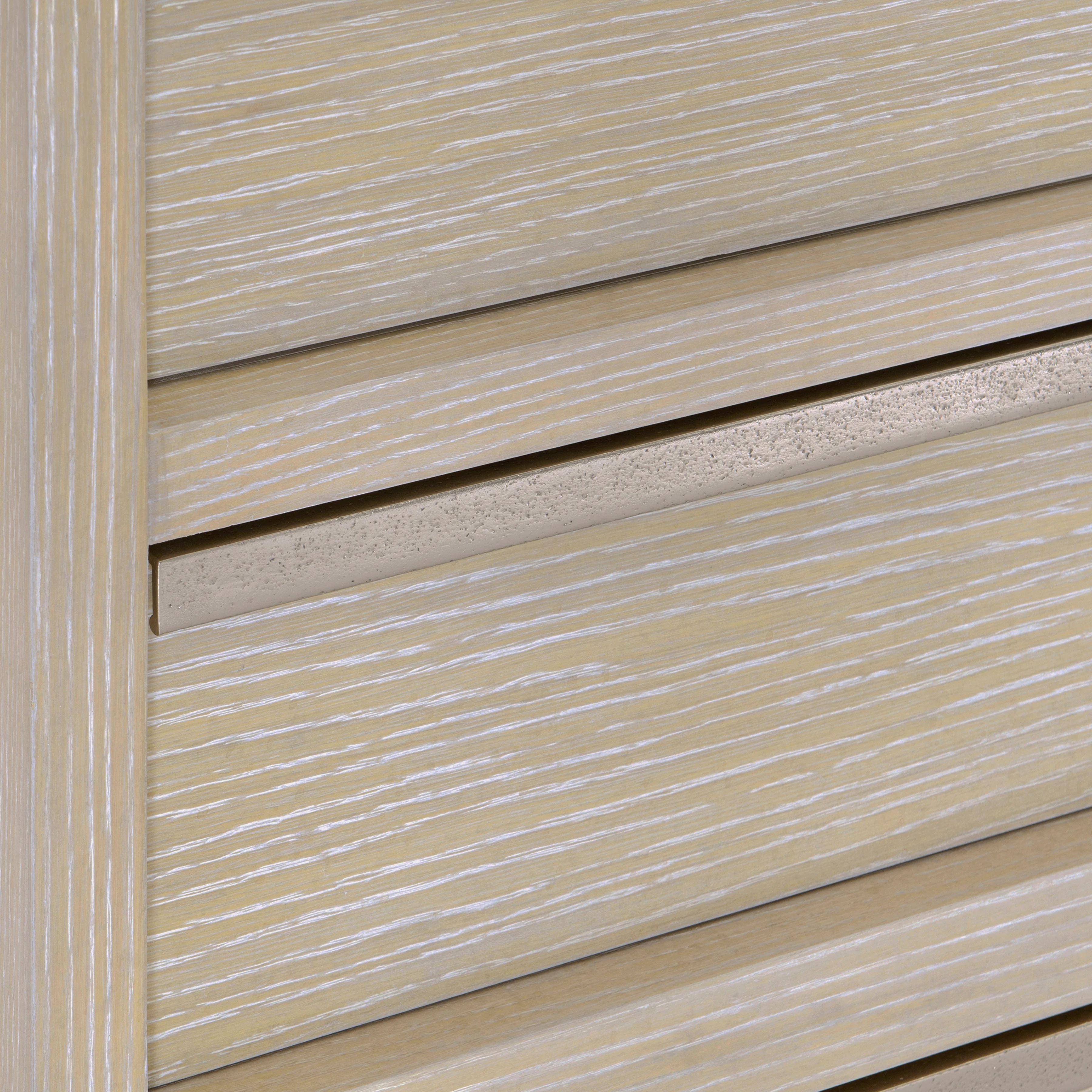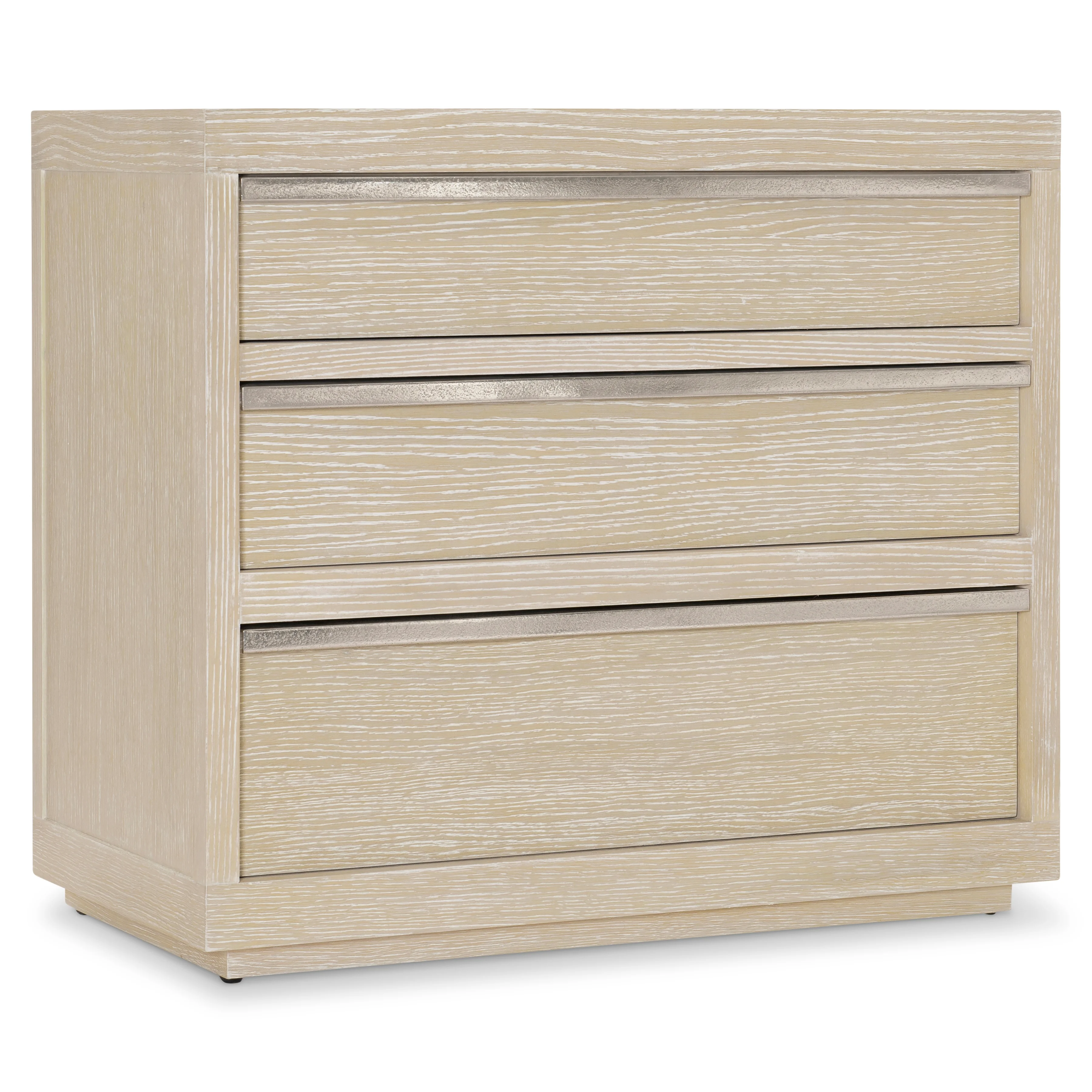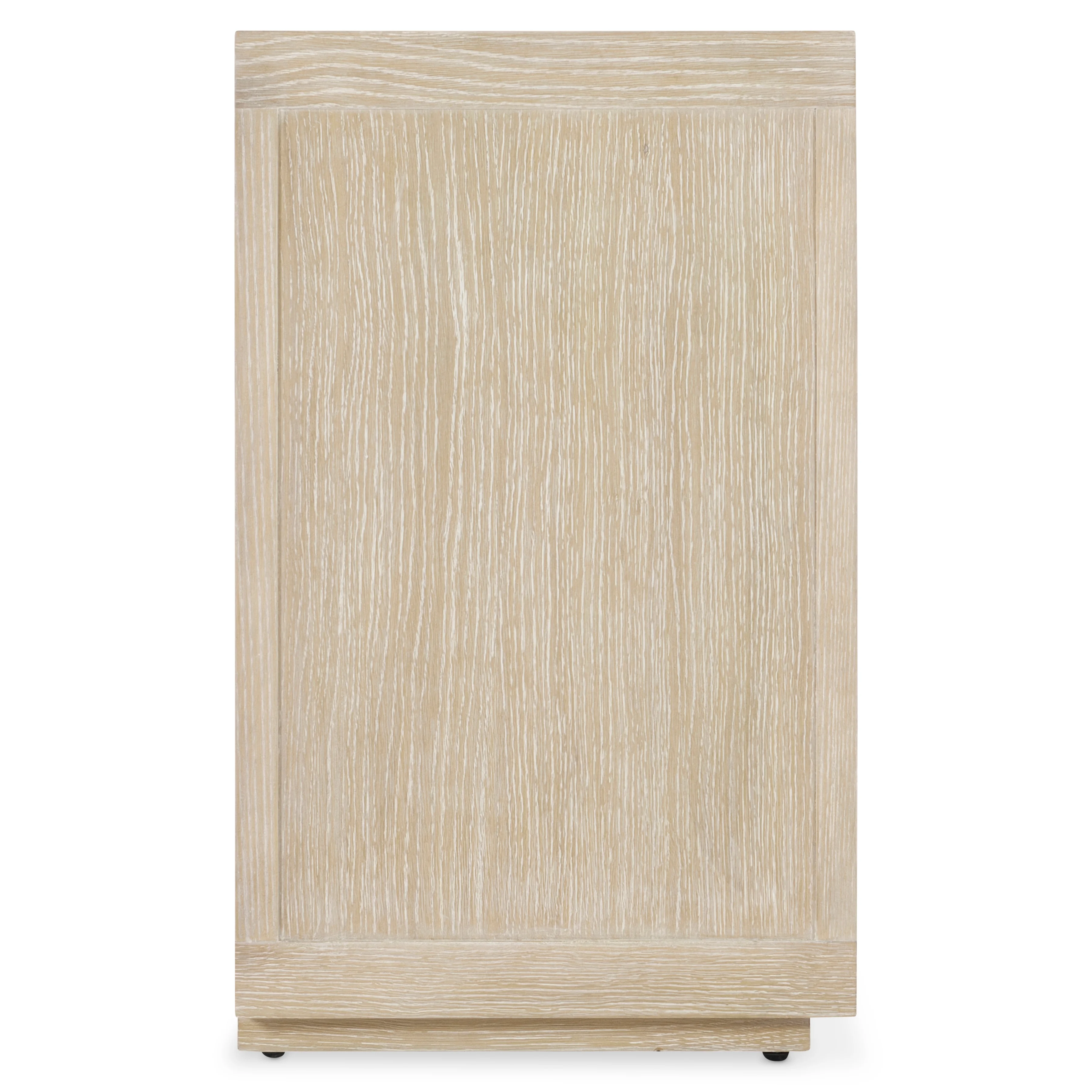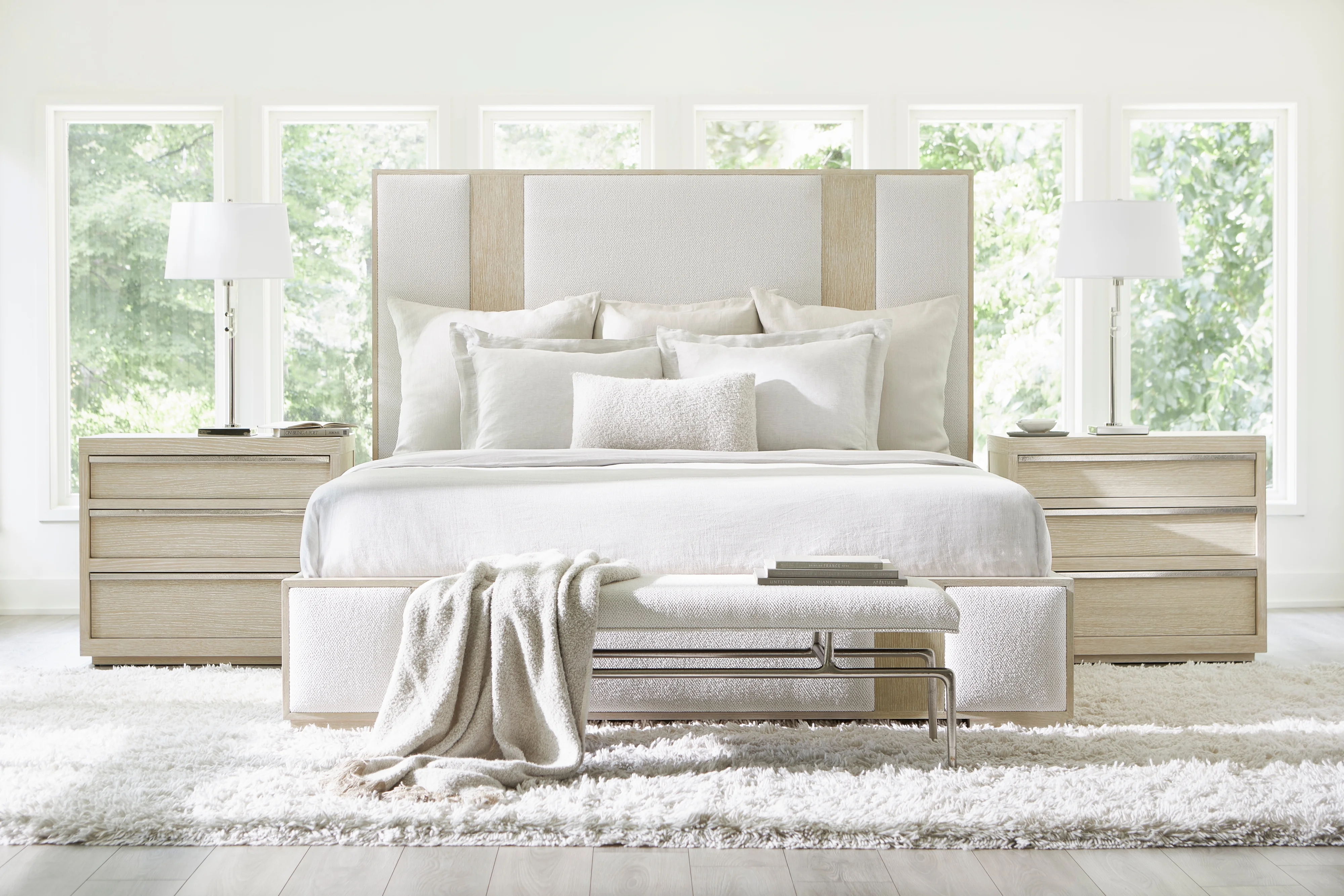 Subtlety defines the Solaria nightstand, crafted from ash solids and quartered white oak veneers in a Dune finish. At first glance, it appears to be an all-wood design, but the quiet sheen of the metal finger pulls draws the eye and defines the form. Three drawers create essential storage, and a two-port USB charger is found on the back panel of the case.