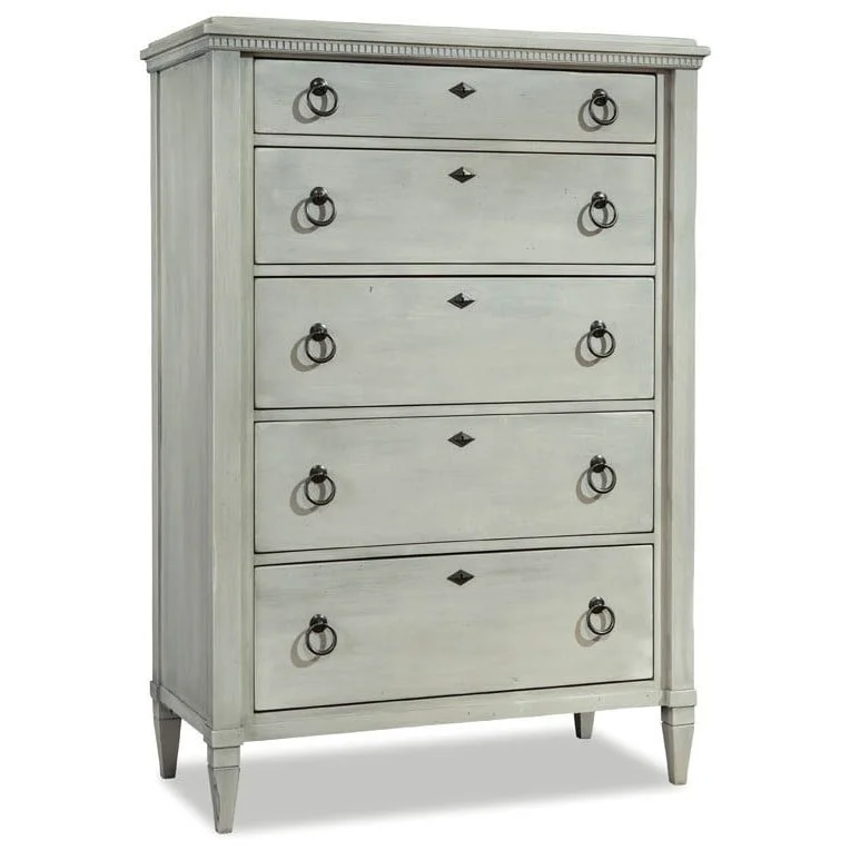 moreThis drawer chest is adorned with ring pulls and dentil molding for a classic appearance. Five drawers provide ample storage space. Customize the chest by choosing from a variety of finish options.