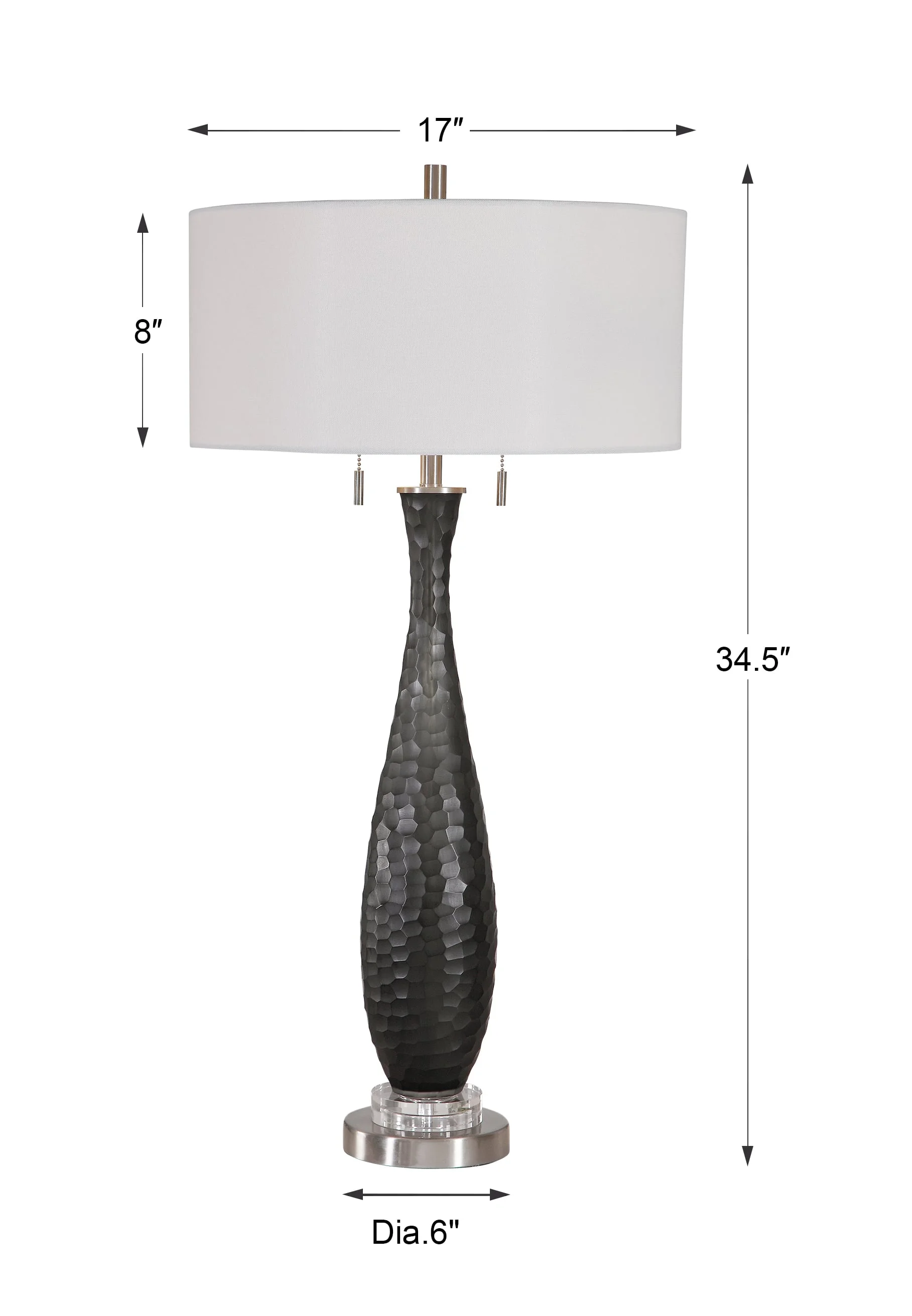This Table Lamp Showcases A Shapely, Frosted Black Glass Base In A Honeycomb Pattern. Brushed Nickel Hardware And A Crystal Accent On The Foot Create A Clean, Contemporary Look. A White Linen Drum Shade Completes This Piece.