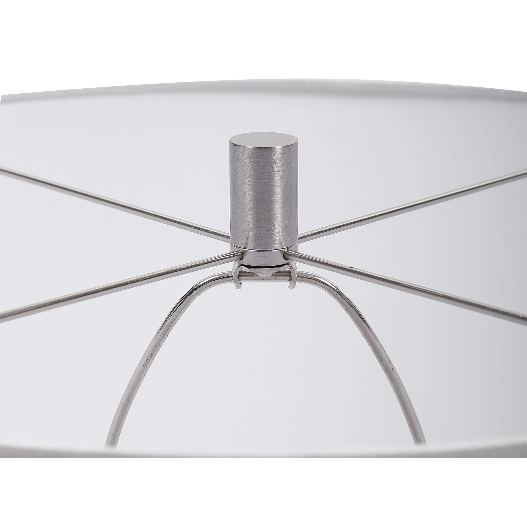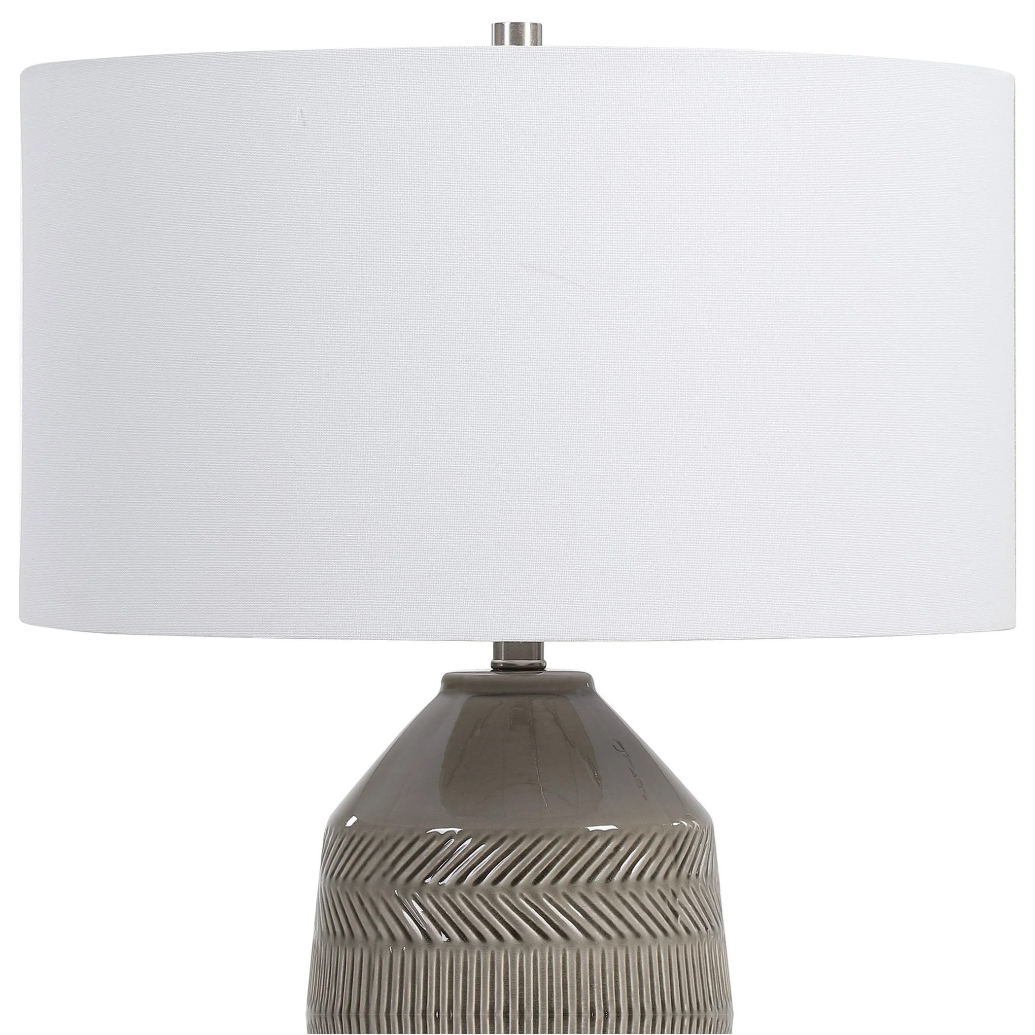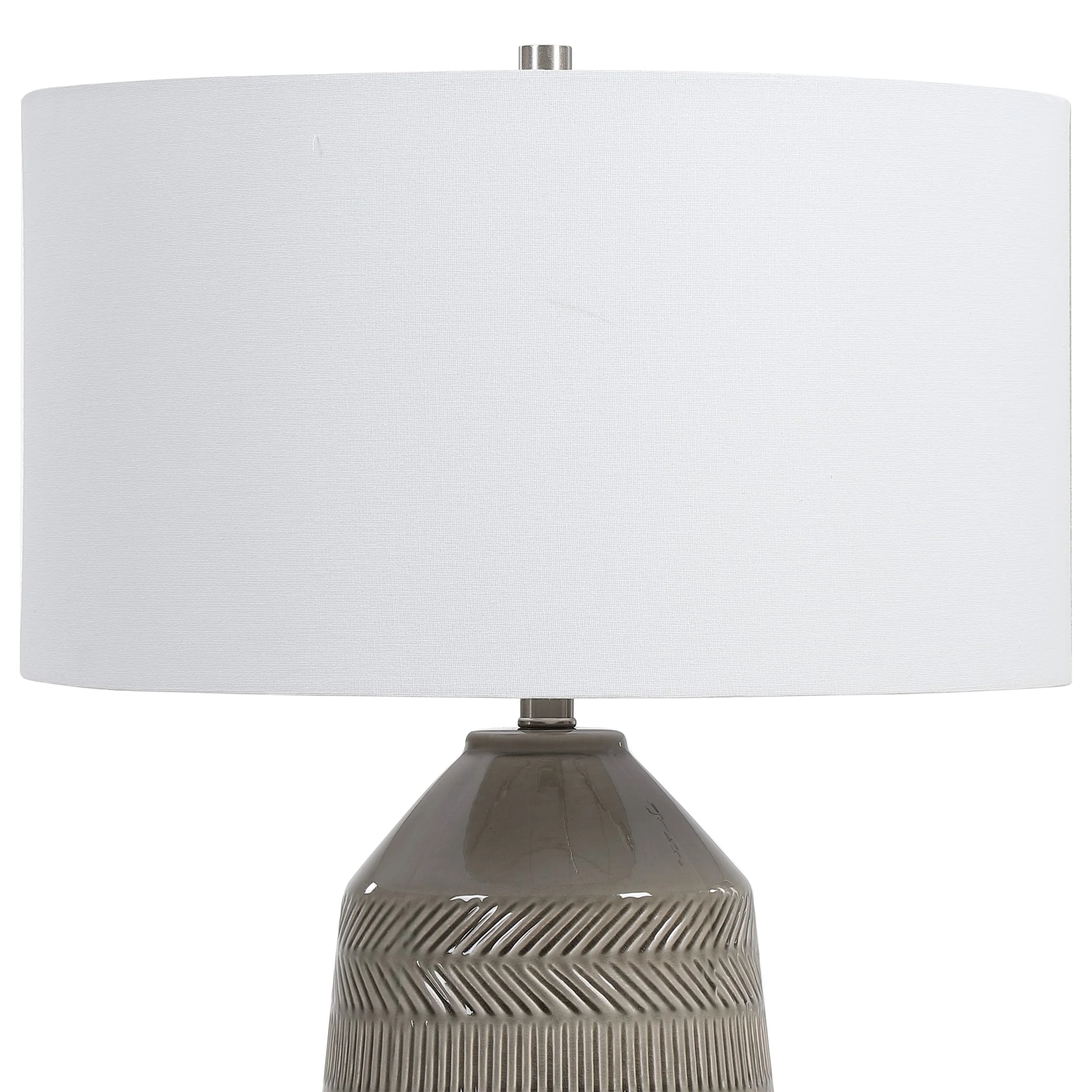 Showcasing a classic carved herringbone pattern, this ceramic table lamp is finished in a versatile soft gray glaze with brushed nickel accents. A white fabric drum shade completes the look.