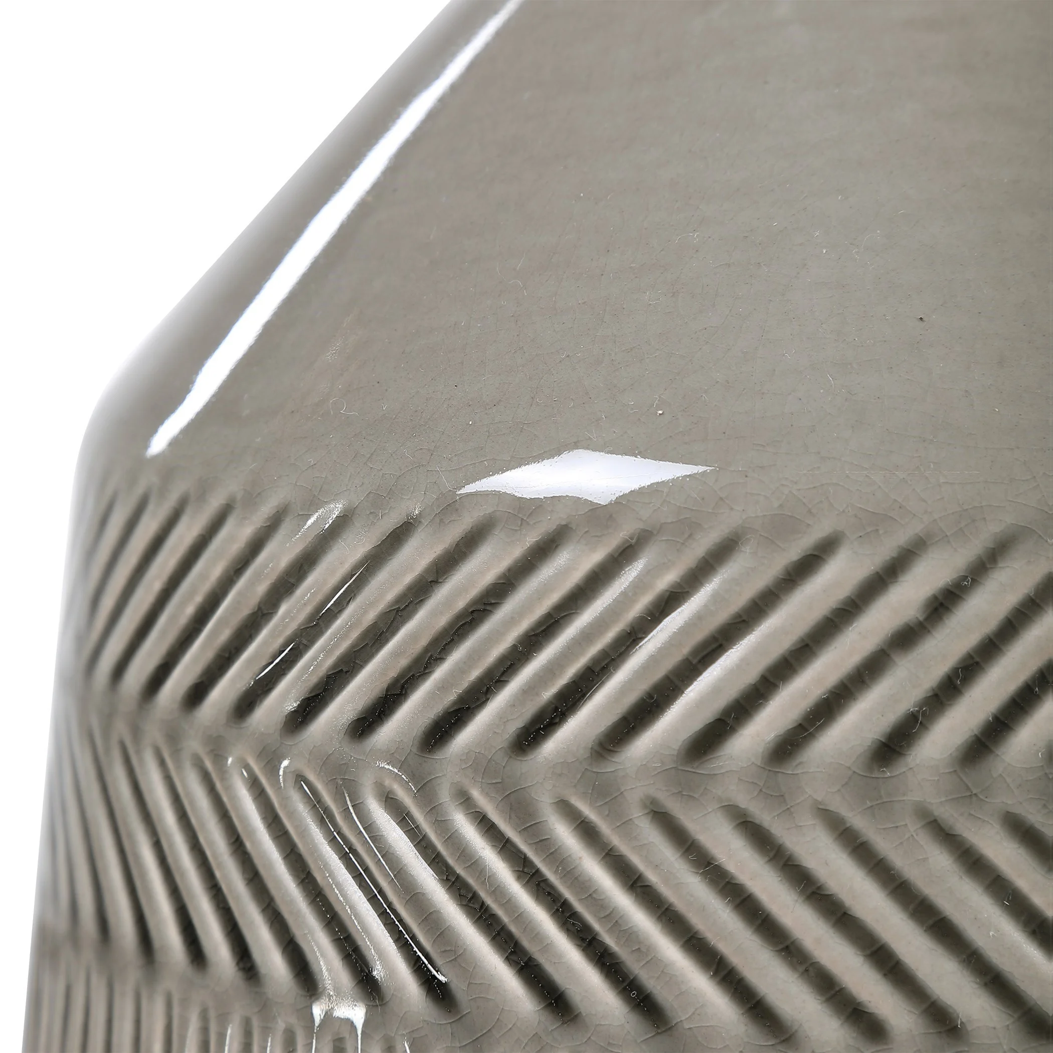 Showcasing A Classic Carved Herringbone Pattern, This Ceramic Table Lamp Is Finished In A Versatile Soft Gray Glaze With Brushed Nickel Accents.
