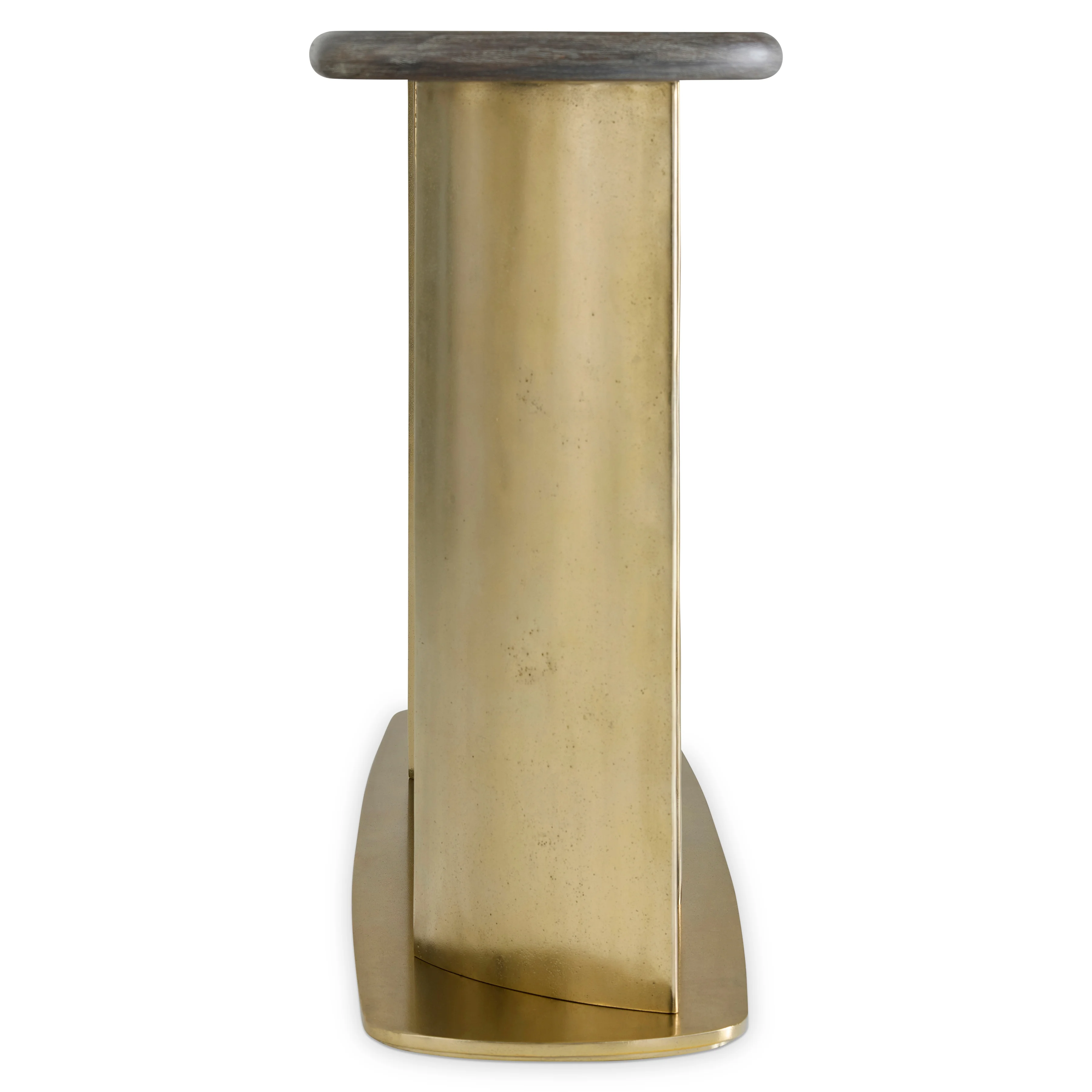 The style stakes are definitely raised on the Trost console table's modern design. Four turned metal pillars rest on a metal base, offering a textured side and a smooth side in Dorado Gold. They support a slim, rounded mahogany top in the Bracken finish.