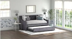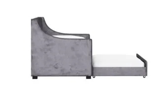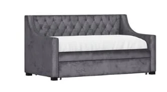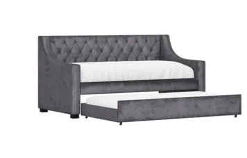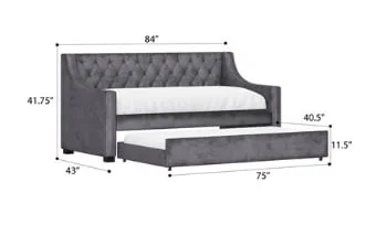 moreThe Cynthia Daybed makes every guest feel like they're staying in a five-star retreat. The moment you see its tufted back, solid wood legs, and silver nailhead trim, it’s clear this daybed is a statement piece. The rich charcoal velvet upholstery accentuates any room with elegance and warmth. Its lustrous finish subtly shifts in color depending on the light and angle. Beneath the beauty lies practicality—a trundle on wheels that rolls out smoothly, ready to host an extra guest or store essentials with its handy divider. The Cynthia Daybed brings a traditional yet glam twist to any corner of your home.