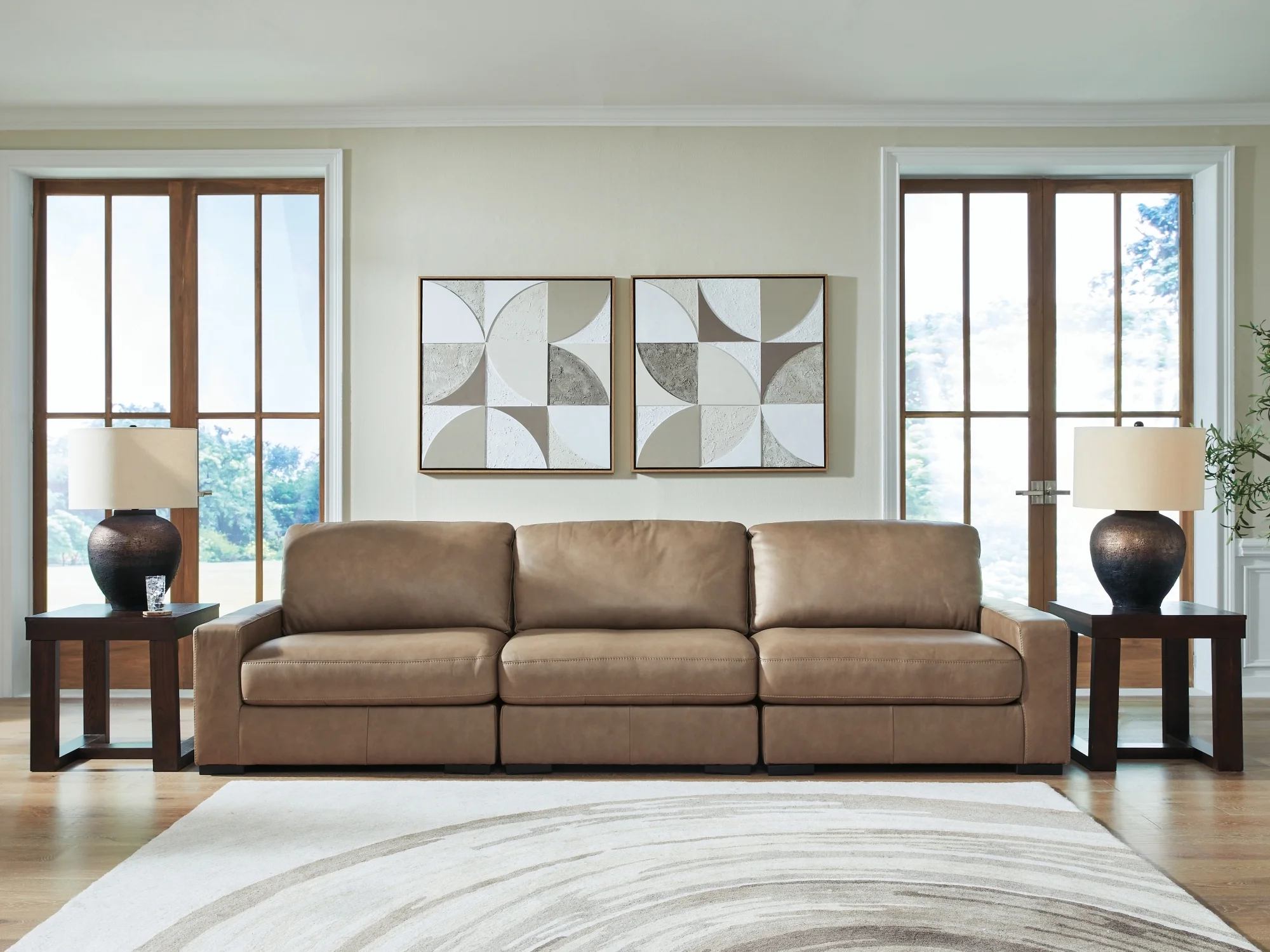moreRefined design meets classic comfort in this sectional sofa. Ultra-chic brown leather covers its seating areas, reflecting an on-trend approach to style. Elevating your space on a budget? Expertly matched faux leather keeps this sleek sectional affordably luxurious. And with a versatile modular design, you can arrange and rearrange the pieces to suit your changing needs.