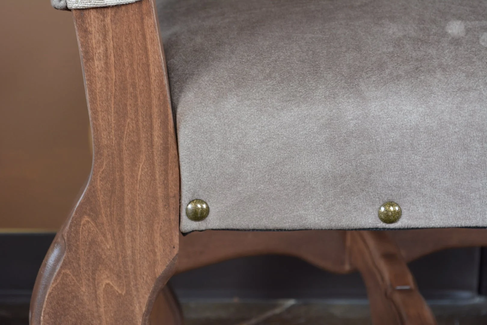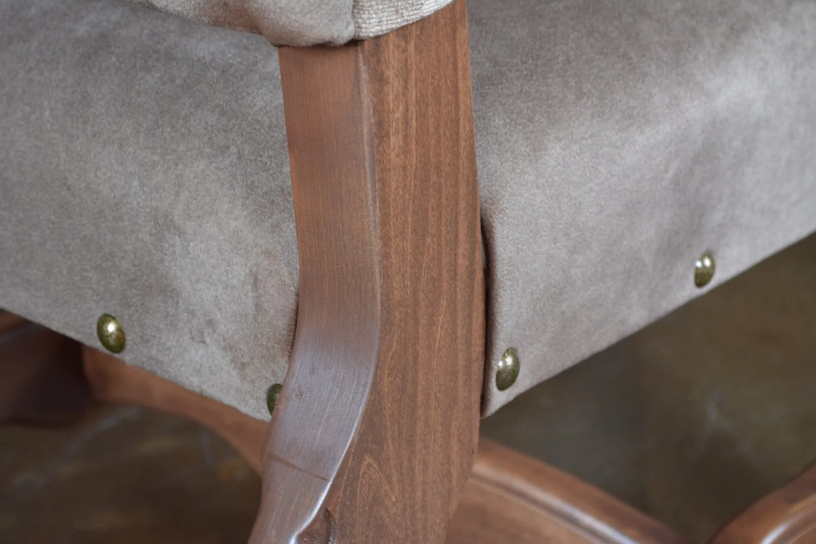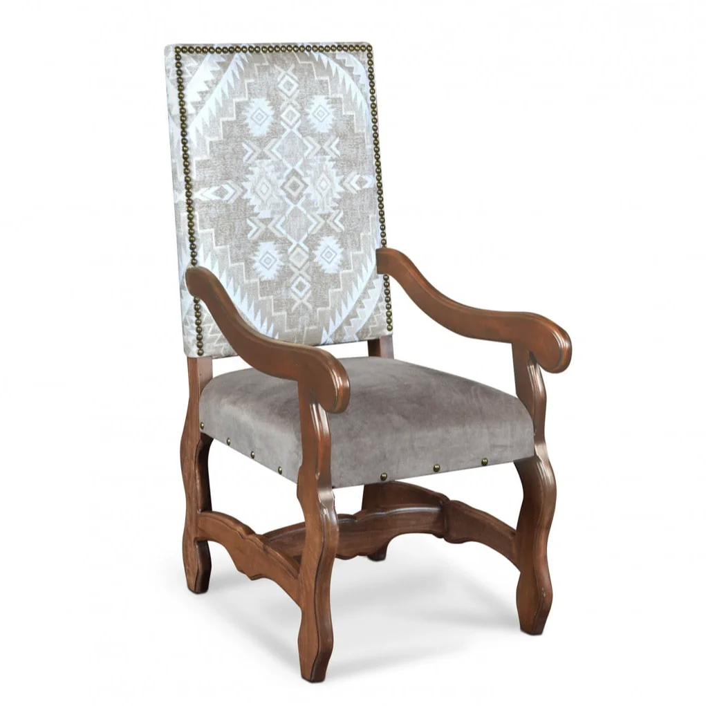 The Rustic Arm Chair with Suede Fabric Seat and Nail Head Detailing, made by Horizon Home,
