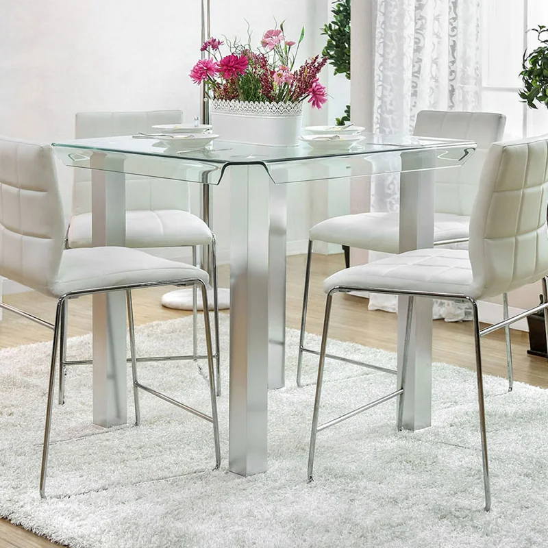 moreQuite the attention grabber, this collection will immediately become the focal point of your home. Family and friends are sure to admire your fine taste when they lay eyes on this one-of-a-kind table. Bold posts create a sturdy base for the 10mm tempered glass top featuring smooth, curved edges. Contrasting the thick table legs are thin chrome legs on the chairs with padded leatherette seats and backs. This set is available in both standard and counter height.