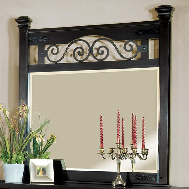 moreWith country charm and rustic beauty, this mirror brings in a calm and classic feel to any bedroom. Crafted of solid woods and veneer, the warm tones of the espresso finish and ornate metalic accents help to create a quiet and relaxing mood. Also available in American oak finish.