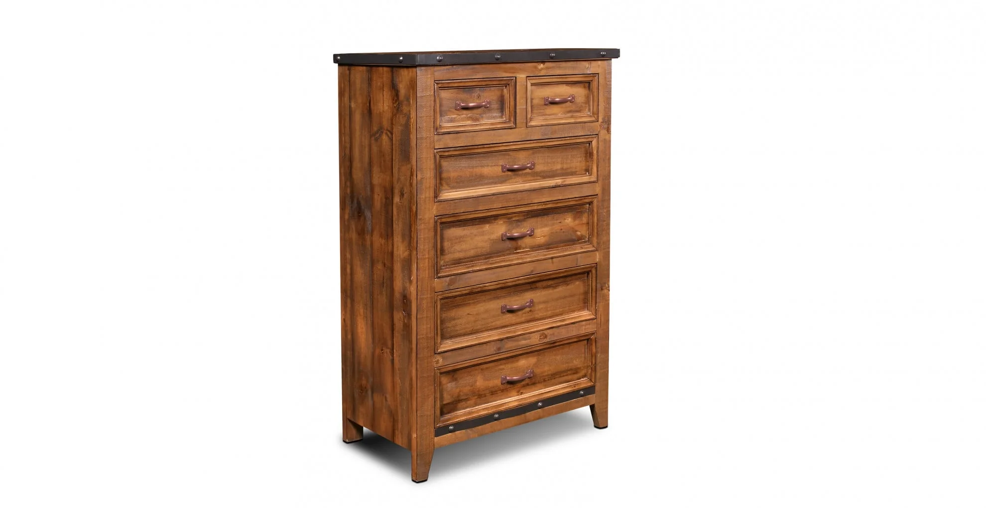 moreSoft industrial rustic look in solid pine construction. Powder coated finish on all metal banding and decorative nails. Full extension glides on every drawer. Burnished lacquer finish provides the perfect urban rustic feel. Mortise tenon joinery on every case piece.